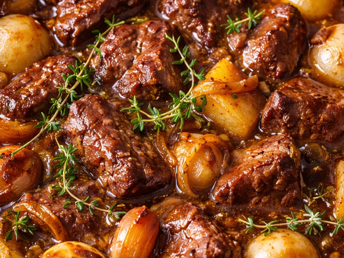 Бавното печене прави месото крехко, а лукът се превръща в кадифена част от соса