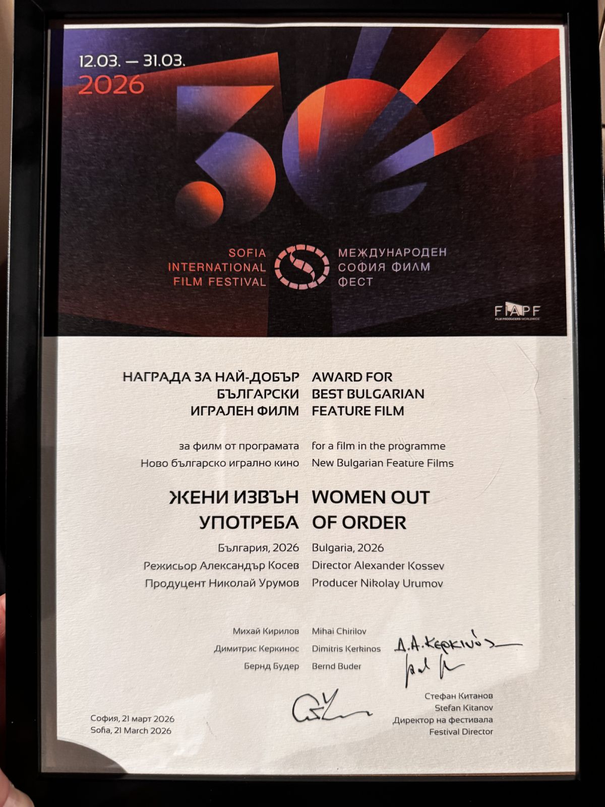 Авторитетно жури в рамките на Международния София Филм Фест 2026, съставено от фестивалните селекционери Михай Кирилов (програмен директор на МФФ Трансилвания в Клуж, Румъния), Димитрис Керкинос (програматор на МФФ Солун, Гърция) и Бернд Будер (програмен директор на МФФ Котбус, Германия), присъди наградата за най-добър български игрален филм на лентата „Жени извън употреба“ на режисьора Александър Косев и продуцента Николай Урумов.