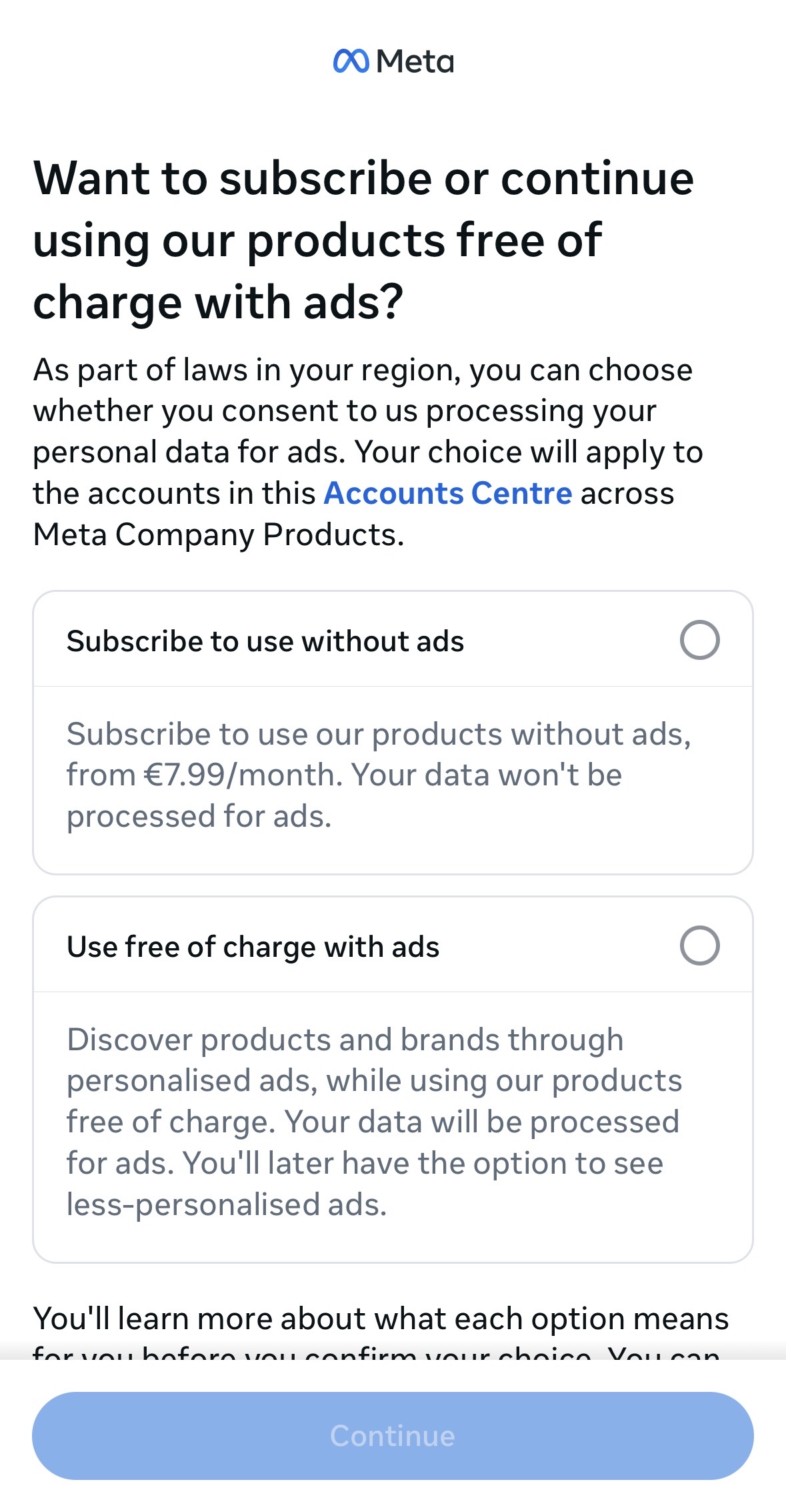 Потребителите са изправени пред две основни опции. Първата е платен абонамент, започващ от 7.99 евро на месец, при който не се показват реклами и личните данни не се използват за рекламни цели. Втората опция позволява безплатно използване на платформата, но включва съгласие за обработка на лични данни и показване на персонализирани реклами. Именно този модел предизвика вълна от критики, като мнозина го определят като форма на „изнудване“ - избор между плащане и отказ от поверителност.