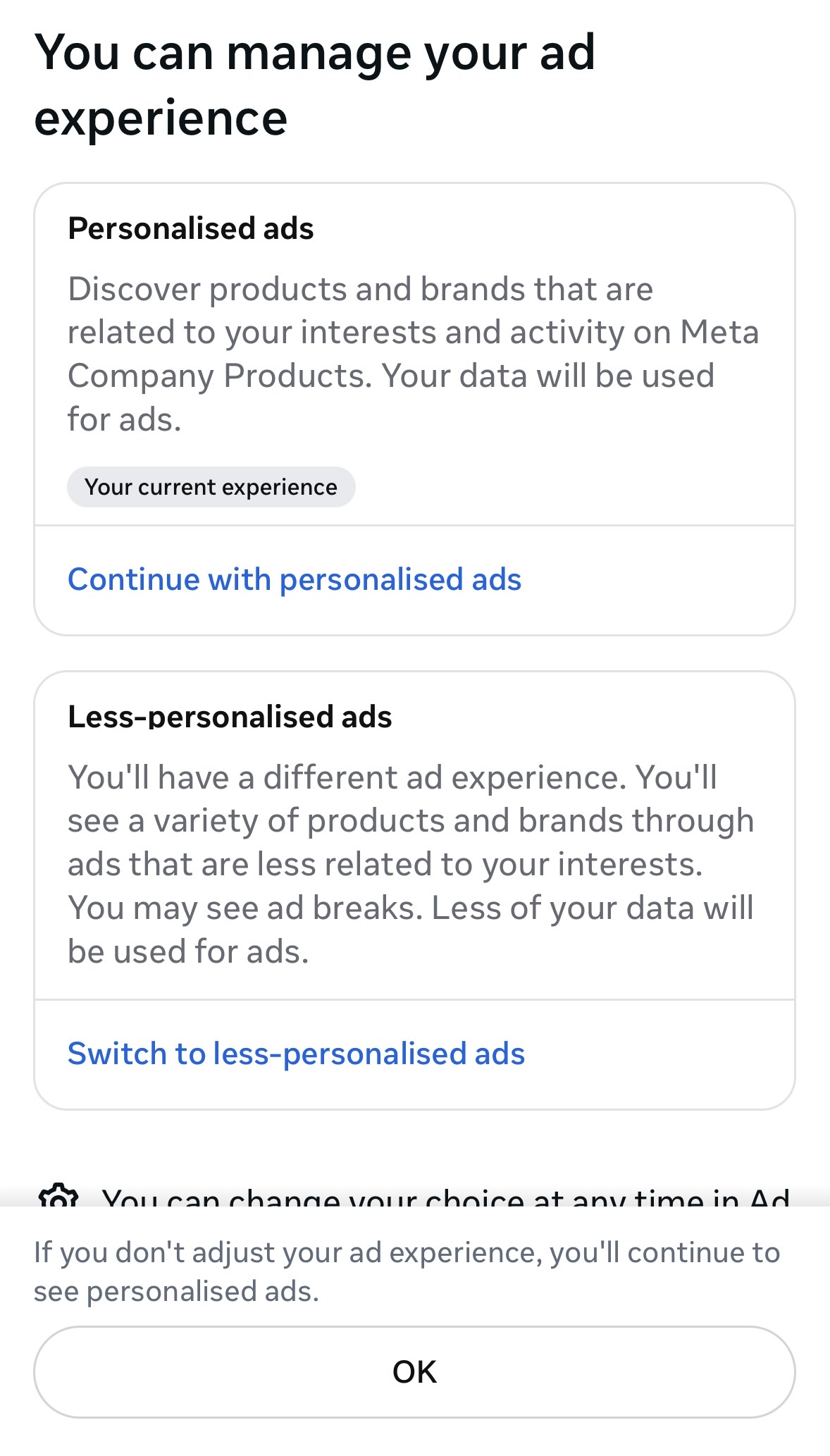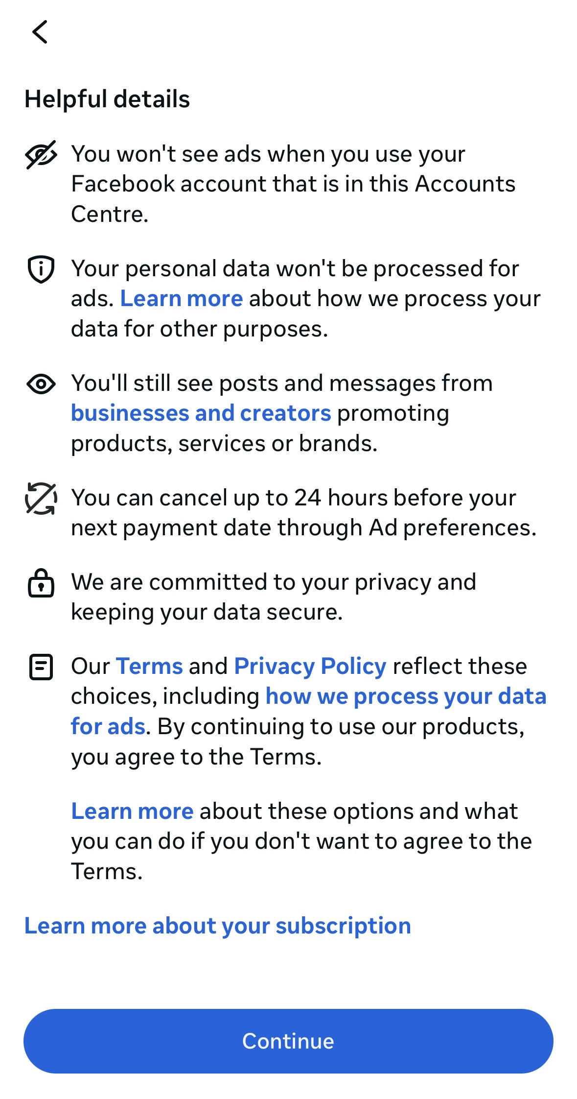 Въпреки общественото недоволство, Meta запазва правото си да изисква избор от страна на потребителите, като достъпът до платформата остава ограничен, докато не бъде избрана една от опциите. Компанията уточнява, че при платения абонамент потребителите няма да виждат реклами и данните им няма да се използват за рекламни цели, но все пак могат да виждат съдържание от бизнеси и създатели, които промотират продукти и услуги.