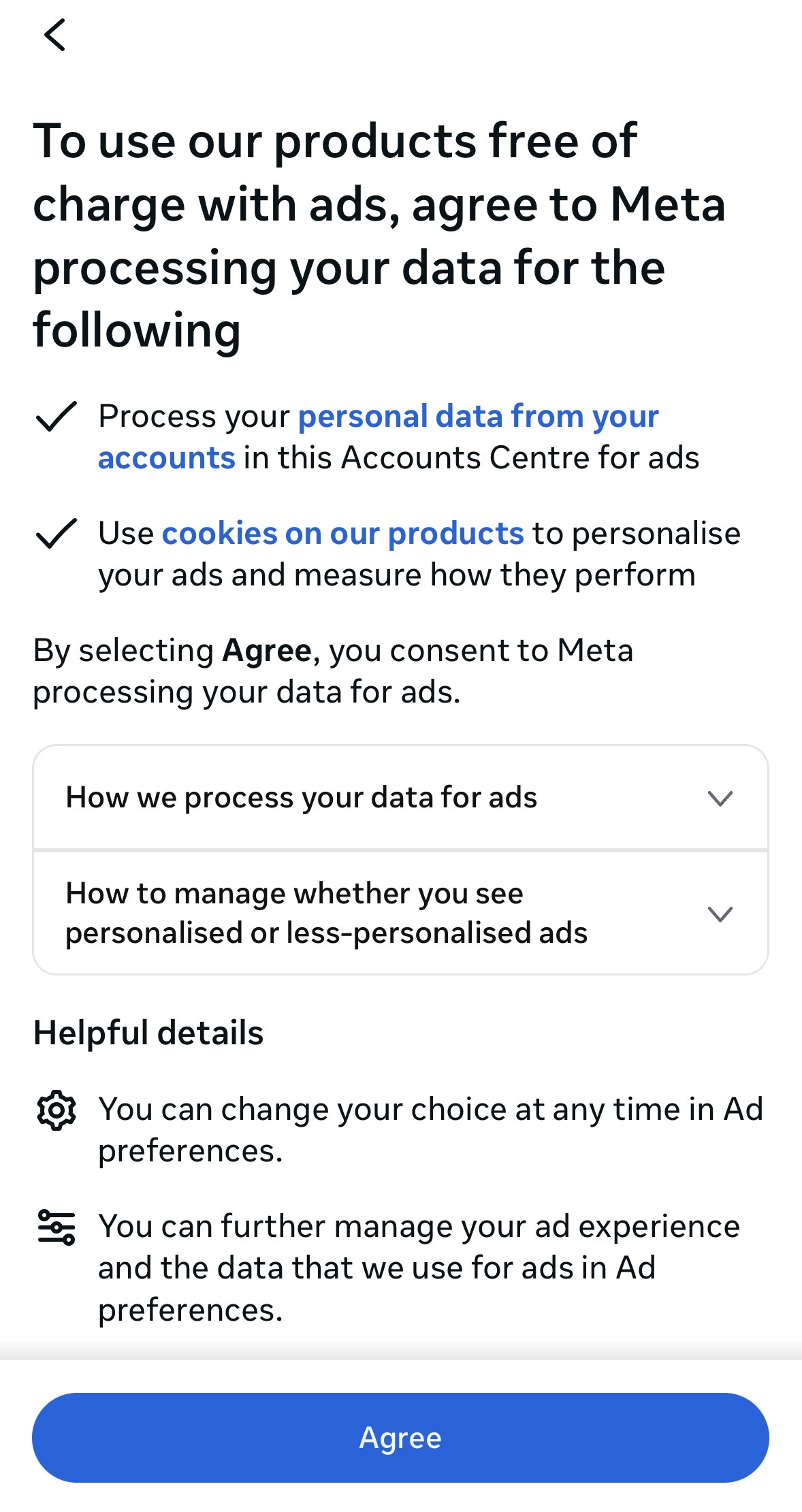 При безплатния вариант потребителите се съгласяват личните им данни да бъдат обработвани за рекламни цели, включително чрез използване на „бисквитки“ за персонализиране на съдържанието и измерване на ефективността на рекламите. Meta подчертава, че изборът може да бъде променен по всяко време чрез настройките за реклами, където потребителите имат възможност да управляват както рекламното си изживяване, така и данните, които се използват за тази цел.