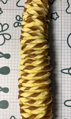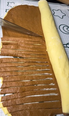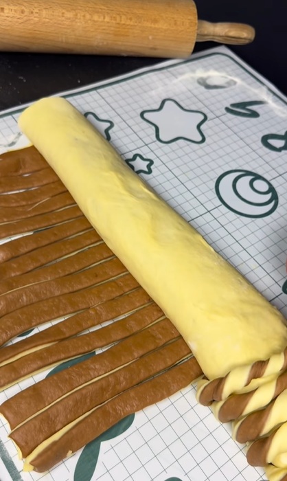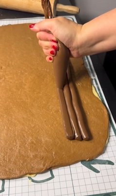 Шприцовайте шоколадов кре по ръба, навийте тестото на 2/3 от края на кората, след което нарежете останалата част на ленти с ширина 2-3 см.