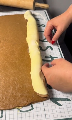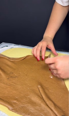 Когато прехвърлите тестото върху работната повърхност, добавете съвсем малко брашно, само за да оформите топка. След това разточете бялото тесто, а след това разточете тъмното и го разстелете върху него.