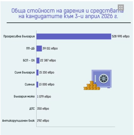 Най-голямото единично дарение от симпатизант възлиза на 50 000 евро. Дадено е от Васил Георгиев, който е посочил в декларацията за произход на средствата, че те са в полза на "Политическо движение Социалдемократи" - една от партиите в ПБ, водена от Елена Нонева. Парите идват от продажба на недвижими имоти за периода от януари 2025 г. до февруари 2026 г., посочено е в декларацията.