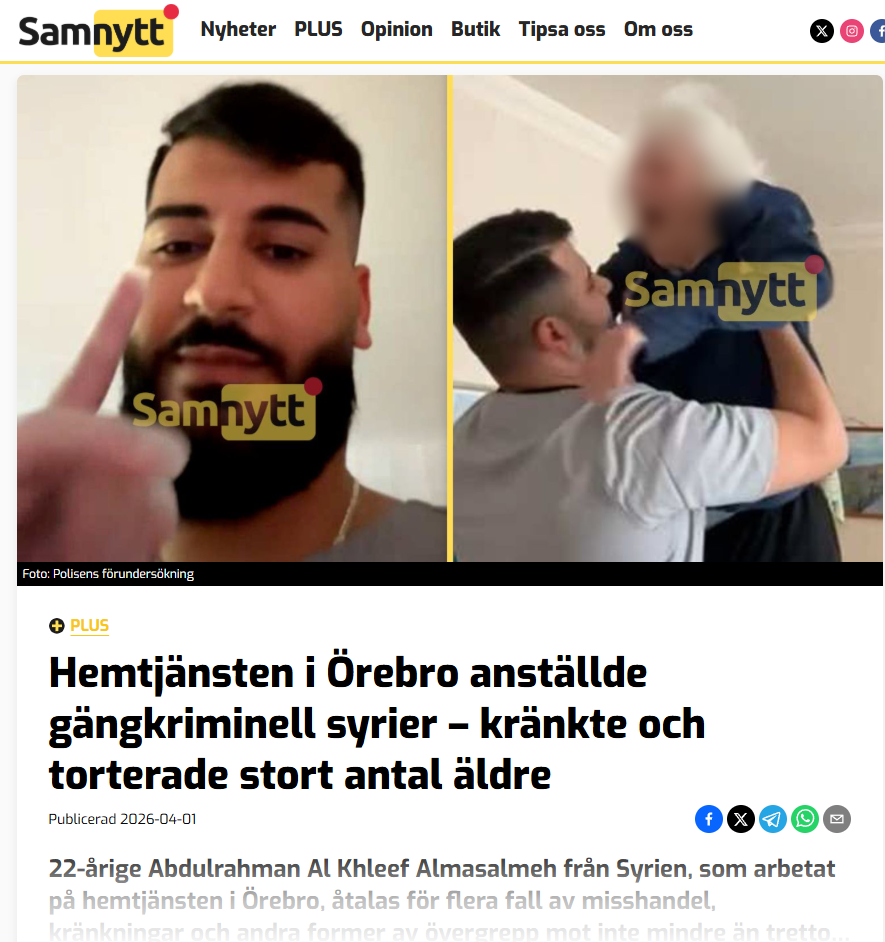 Сирийски мигрант, получил шведско гражданство, се е гаврил цели 8 месеца с възрастни и беззащитни хора, за които е трябвало да се грижи. Той ги наричал маймуни, хвърлял ги във въздуха и ги ловял после с ръце, дърпал ги за носа, вкарвал ги в банята и ги обливал с ледена вода, крещейки им „Аллаху акбар“. Снимал всичко това и на видео, за да е „забавлението“ му още по-голямо. Шведското новинарско издание „Самхелснют“, което първо разкри историята, публикува и кадри от тези записи.