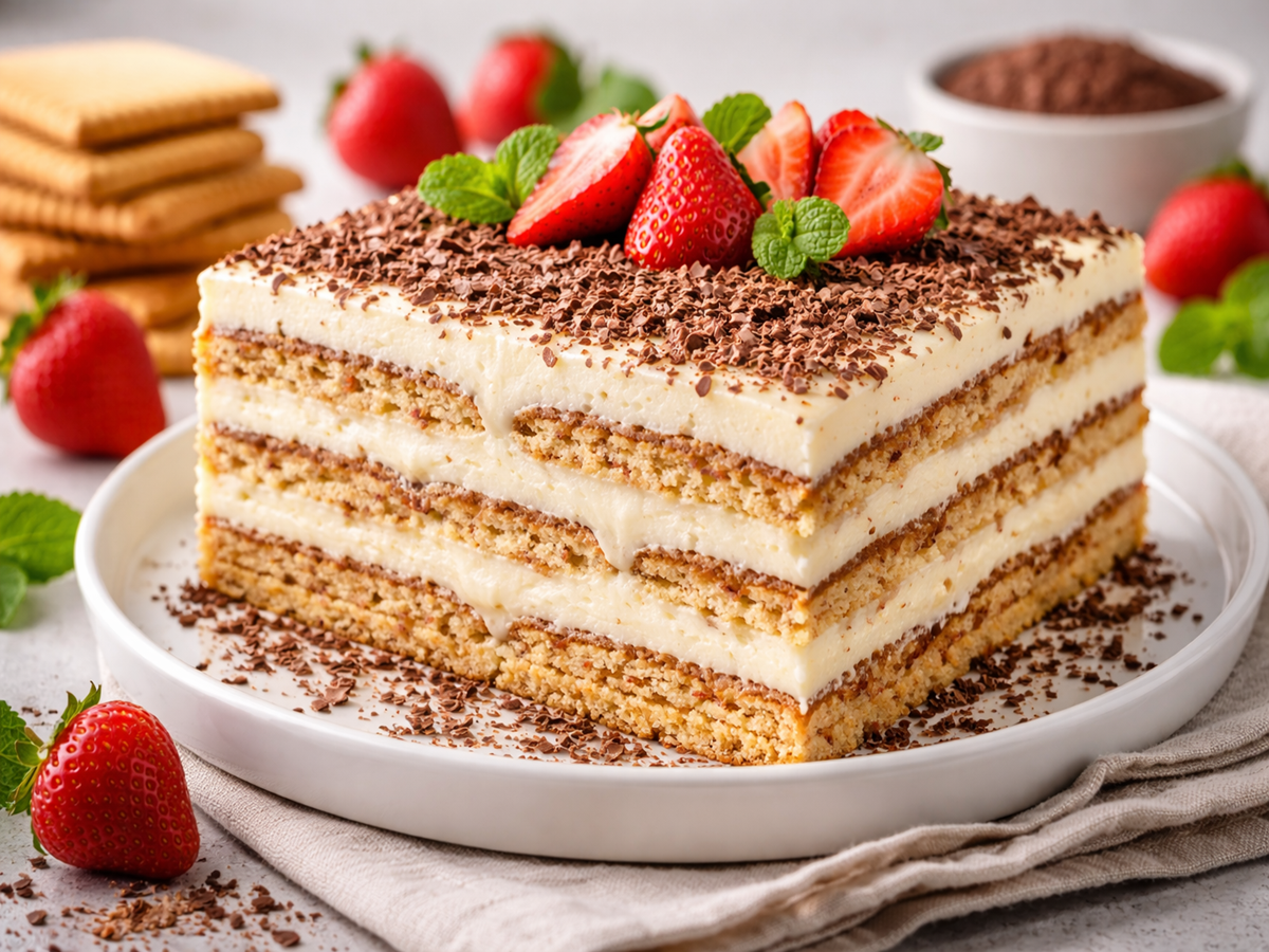 Тънката тайна на този десерт не е в претрупването, а в баланса. Бисквитите трябва да омекнат добре, без да се разпадат, а кремът трябва да бъде гладък, ароматен и достатъчно плътен, за да обгърне всеки пласт. Именно това превръща иначе обикновените съставки в десерт, който изглежда красив и се хапва с удоволствие.
