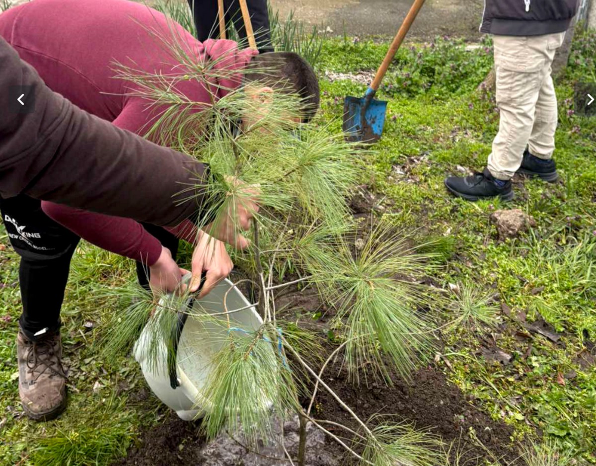 Единадесетокласници от специалност „Горско и ловно стопанство“ участваха в практически урок с лесовъди и засадиха дръвчета в двора на гимназията