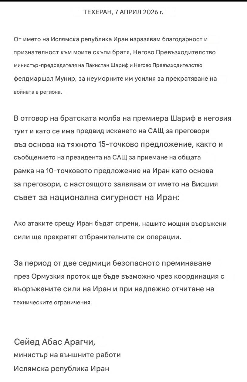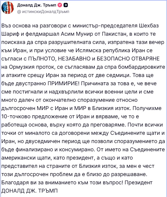 „Въз основа на разговори с министър-председателя Шехбаз Шариф и фелдмаршал Асим Мунир от Пакистан, в които те поискаха да спра разрушителната сила, изпратена тази вечер към Иран, и при условие че Ислямска република Иран се съгласи с пълното, незабавно и безопасно отваряне на Ормузкия проток, се съгласявам да спра бомбардировките и атаките срещу Иран за период от две седмици“, написа дословно американският президент.