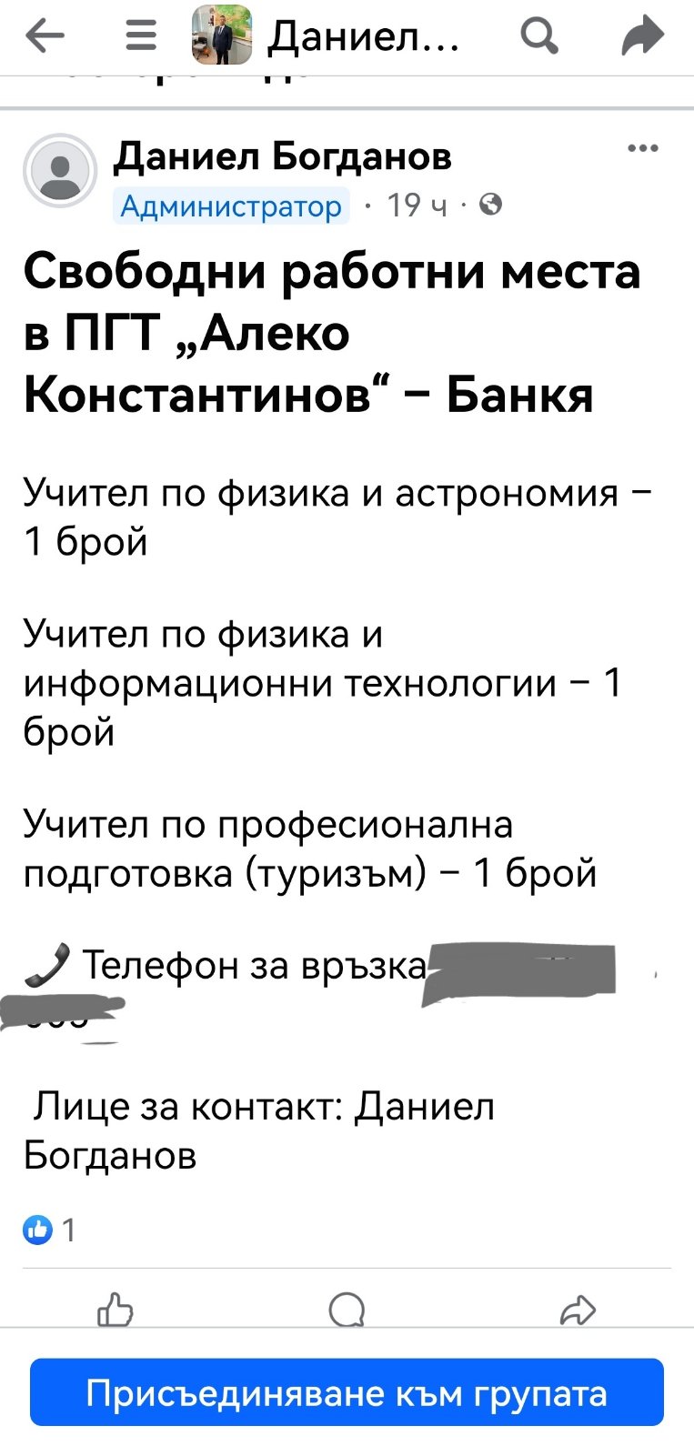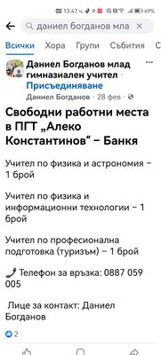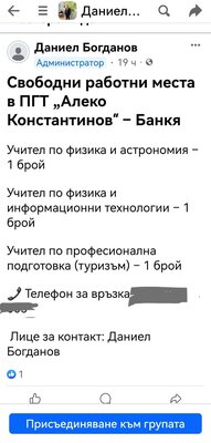 В материалите, с които разполагаме, изпъква и още един проблем. Лично учителят обявява свободни работни места в ПГТ „Алеко Константинов“ в Банкя, а за лице за контакт е посочен самият той, а за връзка е посочен неговият телефонен номер. Работните места не фигурират в Регионалното управление по образование, сочи наша проверка. А когато му се обадиш и питаш за работното място и защо от негово име е обявата, той отговаря "помагам на училището, изтекли са обявите, затова ги няма в РУО".