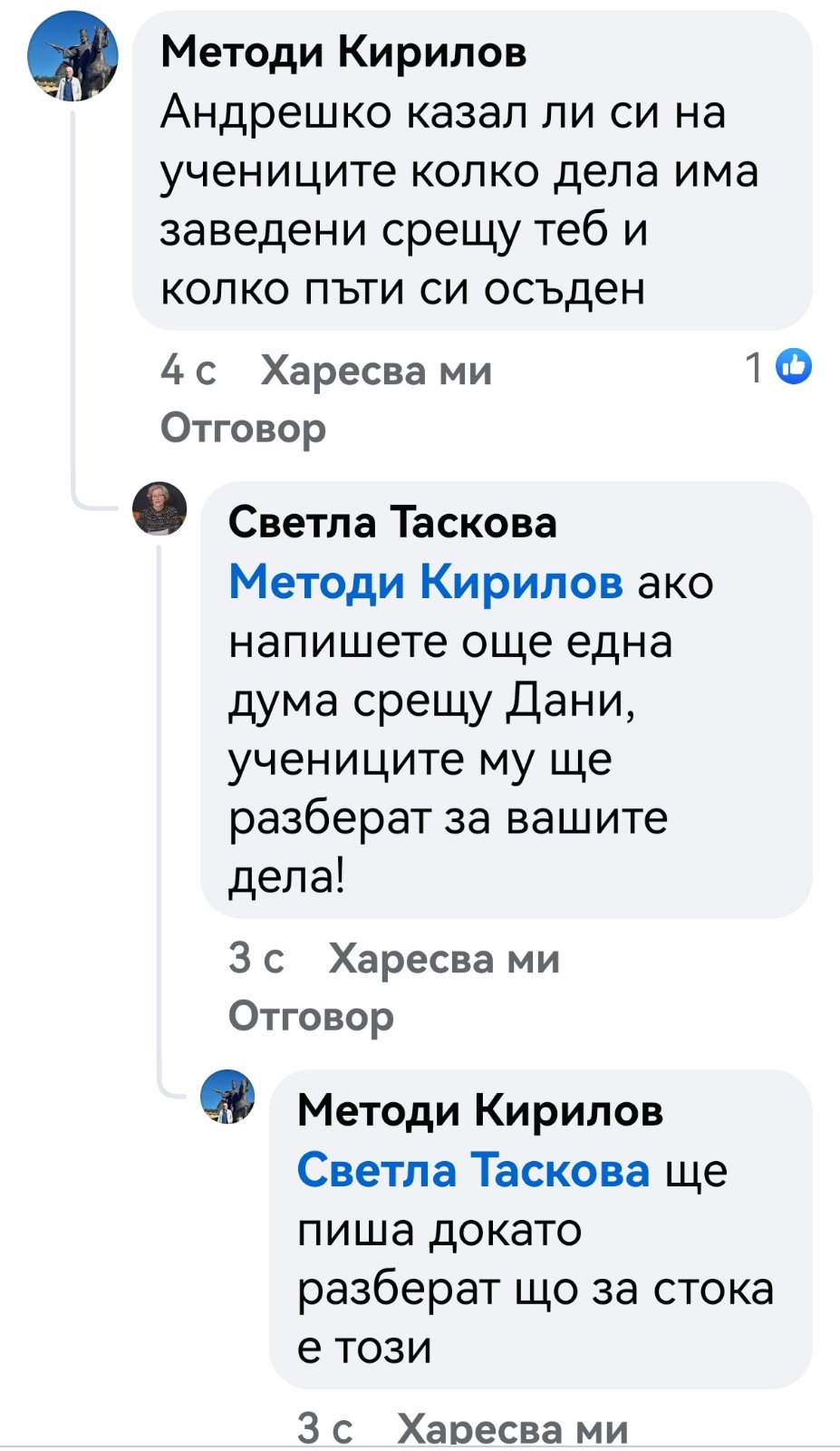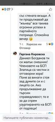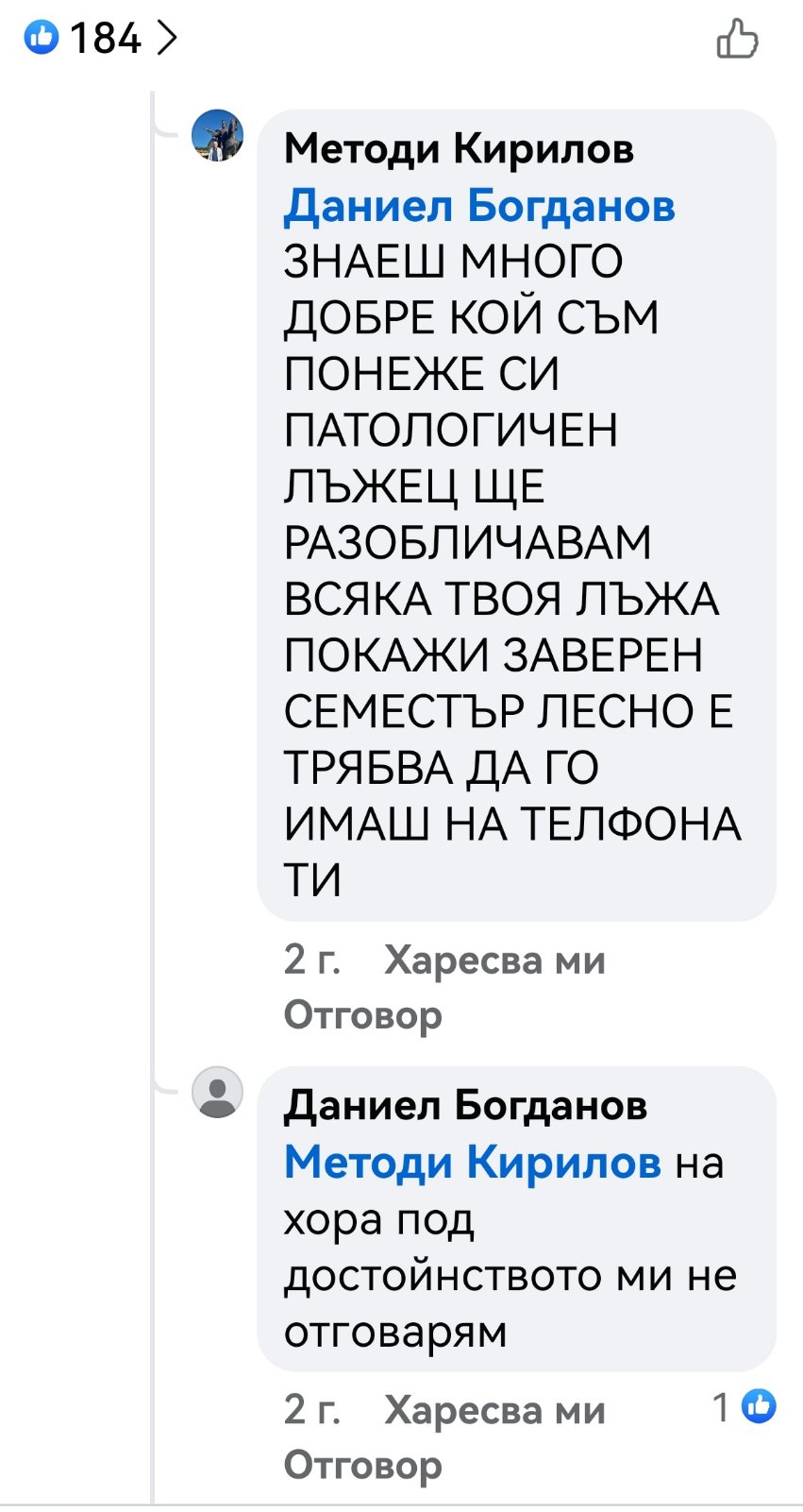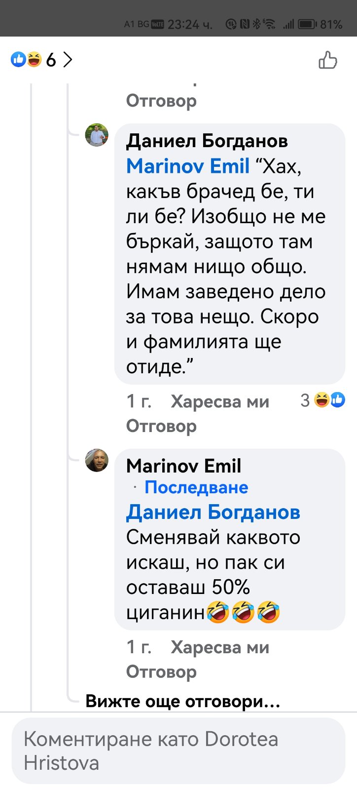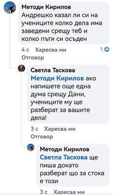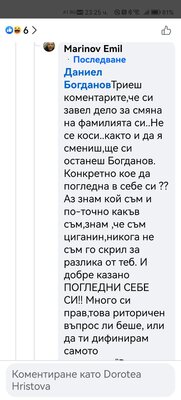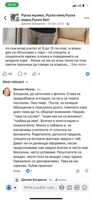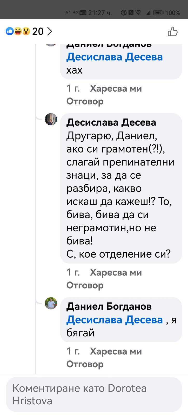 В редица коментари под негови публикации други хора го нападат словесно, обвиняват го в лъжи, неграмотност, съдебни проблеми и дори говорят за осъждания. Подателката твърди още, че Даниел Богданов се хвалел пред учениците, че е заместник-директор. Проверка на Флагман.бг на сайта на учебното заведение показа, че сред ръководството не фигурире неговото име. Трима са заместниците на директора инж. Савина Спасова, но той не е сред тях. Д. Х. твърди още, че има информация за заповед за назначаването му на по-висока длъжност.
