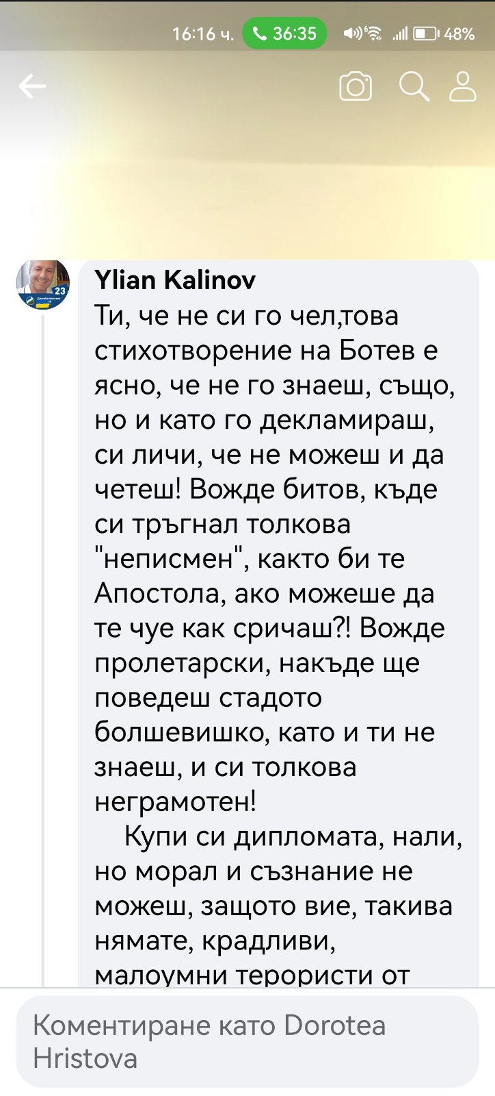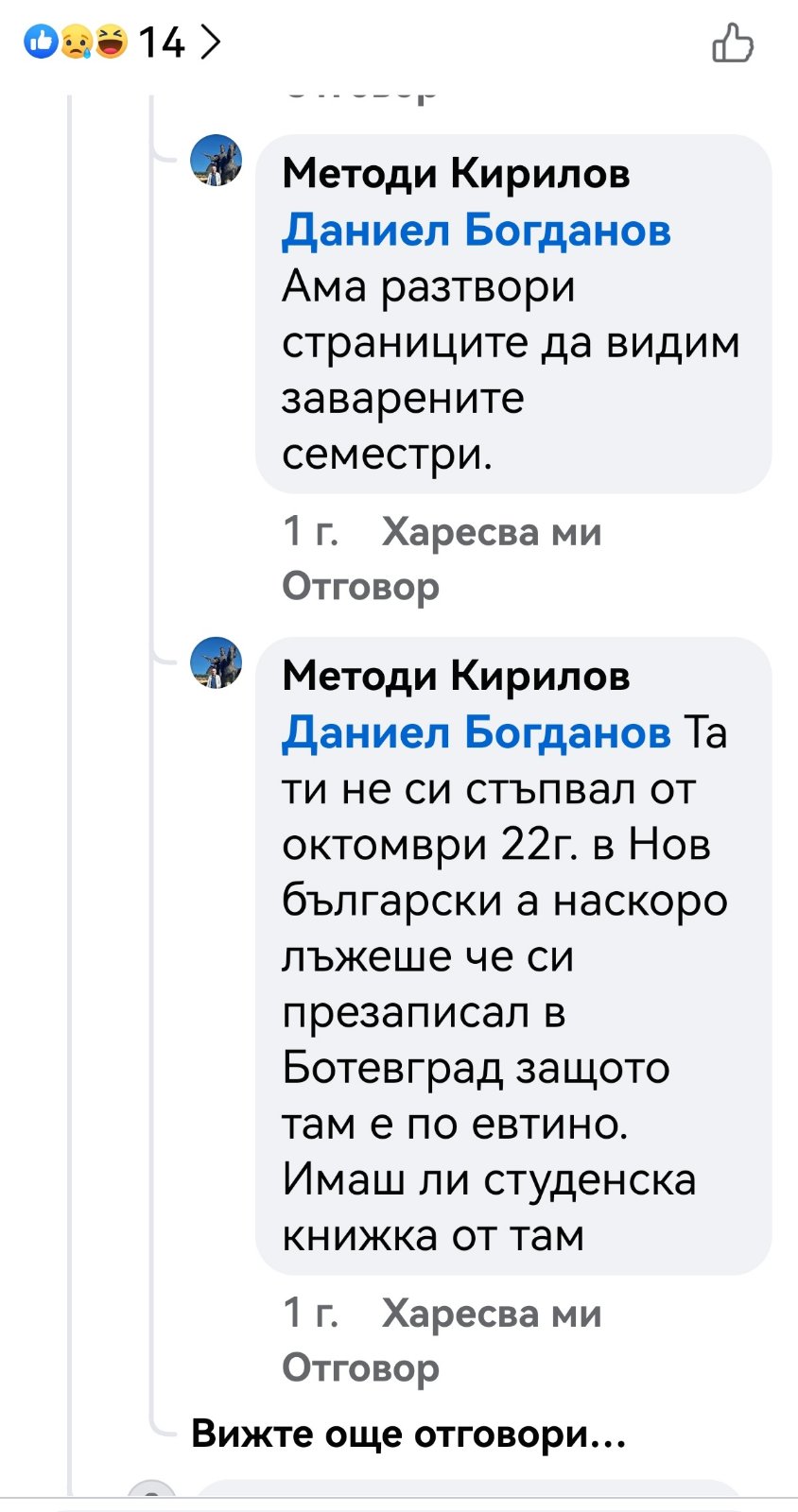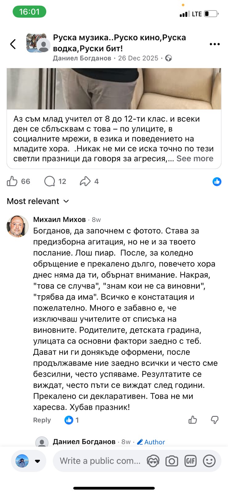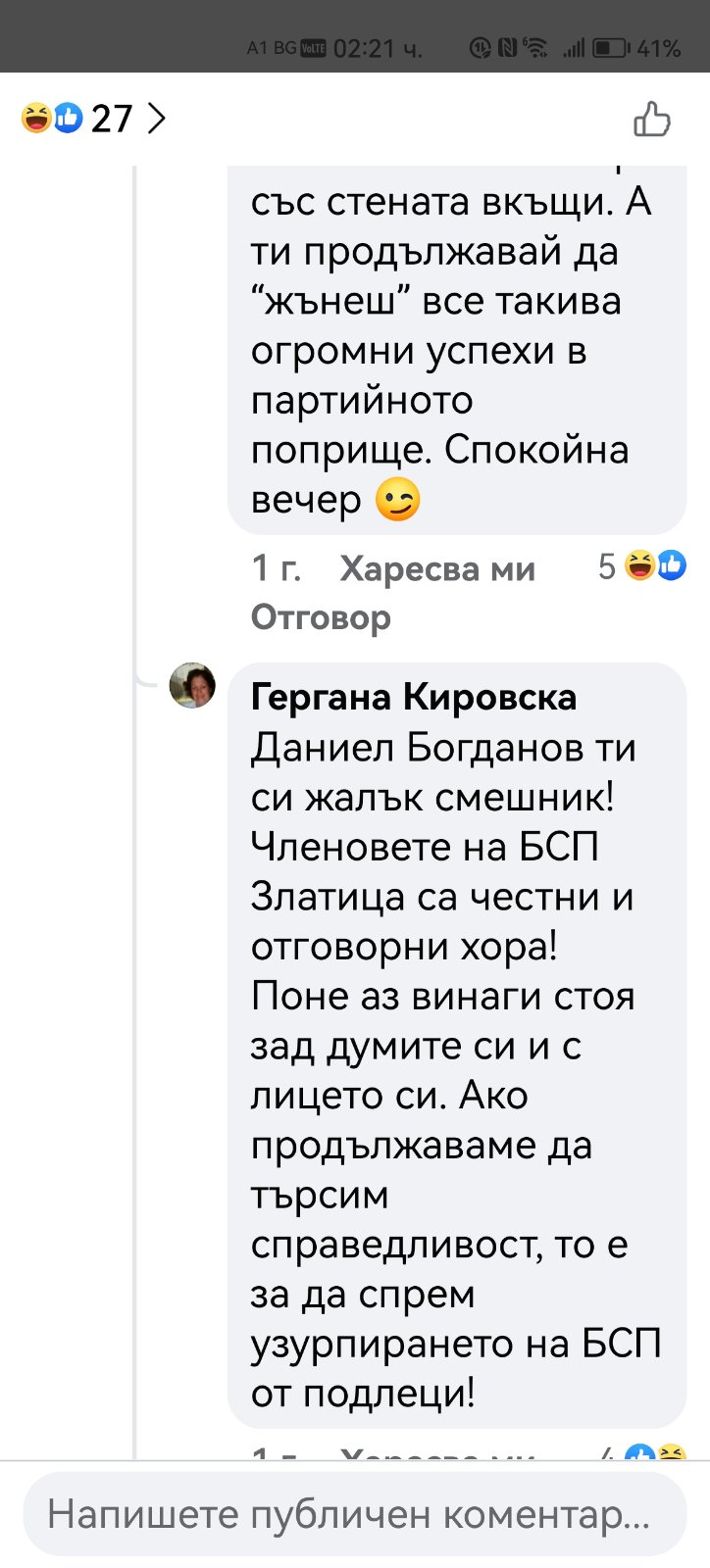 В редица коментари под негови публикации други хора го нападат словесно, обвиняват го в лъжи, неграмотност, съдебни проблеми и дори говорят за осъждания. Подателката твърди още, че Даниел Богданов се хвалел пред учениците, че е заместник-директор. Проверка на Флагман.бг на сайта на учебното заведение показа, че сред ръководството не фигурире неговото име. Трима са заместниците на директора инж. Савина Спасова, но той не е сред тях. Д. Х. твърди още, че има информация за заповед за назначаването му на по-висока длъжност.