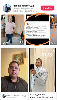 Те ни предоставиха сигнала до институциите, както и видеоклипове, снимки и скрийншотове от социалните мрежи. Даниел Богданов действително е много активен потребител. Дори има собствени фейсбук групи, в които се представя като буден млад човек с леви идеи, учител и общественик, който "отказва да мълчи" и роптае срещу свободния и практически неконтролиран достъп на ученици до вейпове, желирани бонбони и други субстанции с наркотичен ефект, рекламирани открито в интернет и достъпни за всяко дете с телефон. Дотук добре. Изглежда като млад, образован човек, с мнение, което отстоява. Но други публикации в инстаграм, фейсбук и тик-ток, които той лично публикува в профилите си, показват друга тревожна картина, в която се преплитат въпроси за назначаването му за учител, за комуникацията му с учениците, както и за ролята му в дейности, които на пръв поглед нямат нищо общо с преподаването.