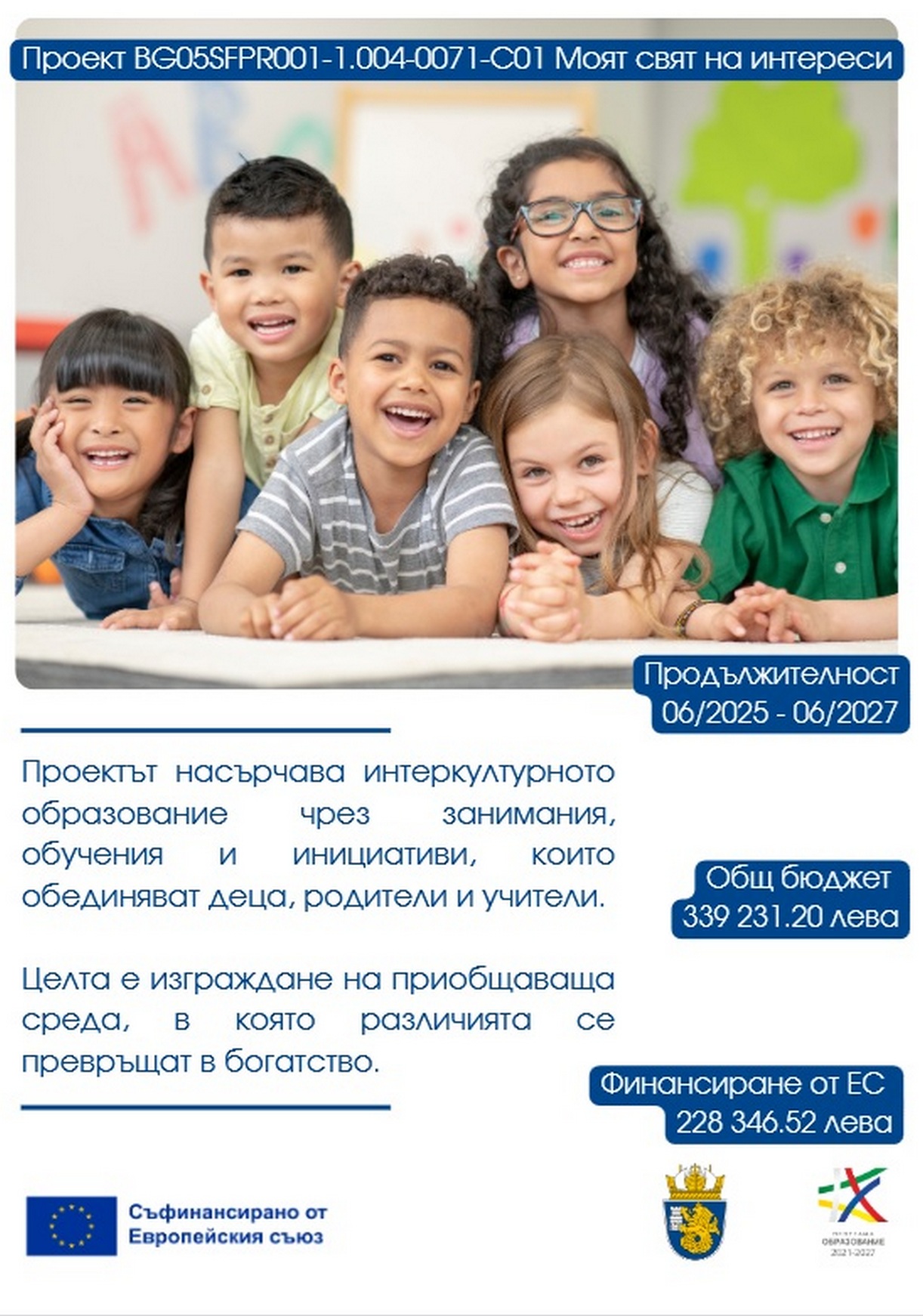 Община Бургас в партньорство с детска градина „Звездица Зорница“, детска градина „Бърборино“ – гр. Средец и Сдружение „Верният настойник“, реализира проект BG05SFPR001-1.004-0071 „Моят свят на интереси“, финансиран по Програма „Образование“ 2021–2027, съфинансирана от Европейския социален фонд плюс (ЕСФ+).