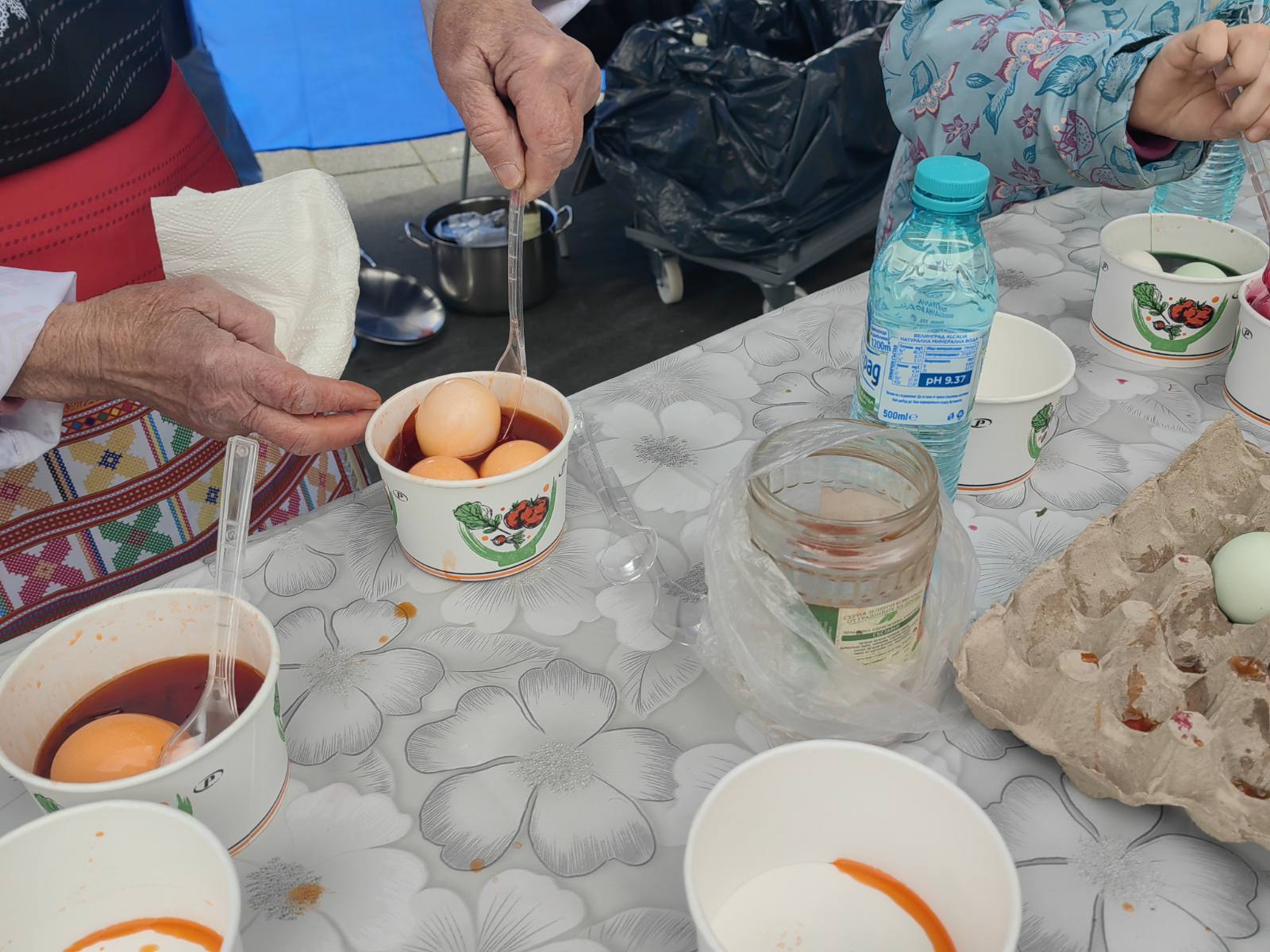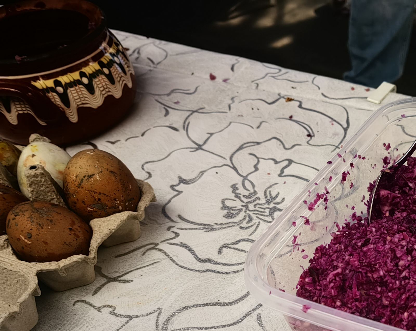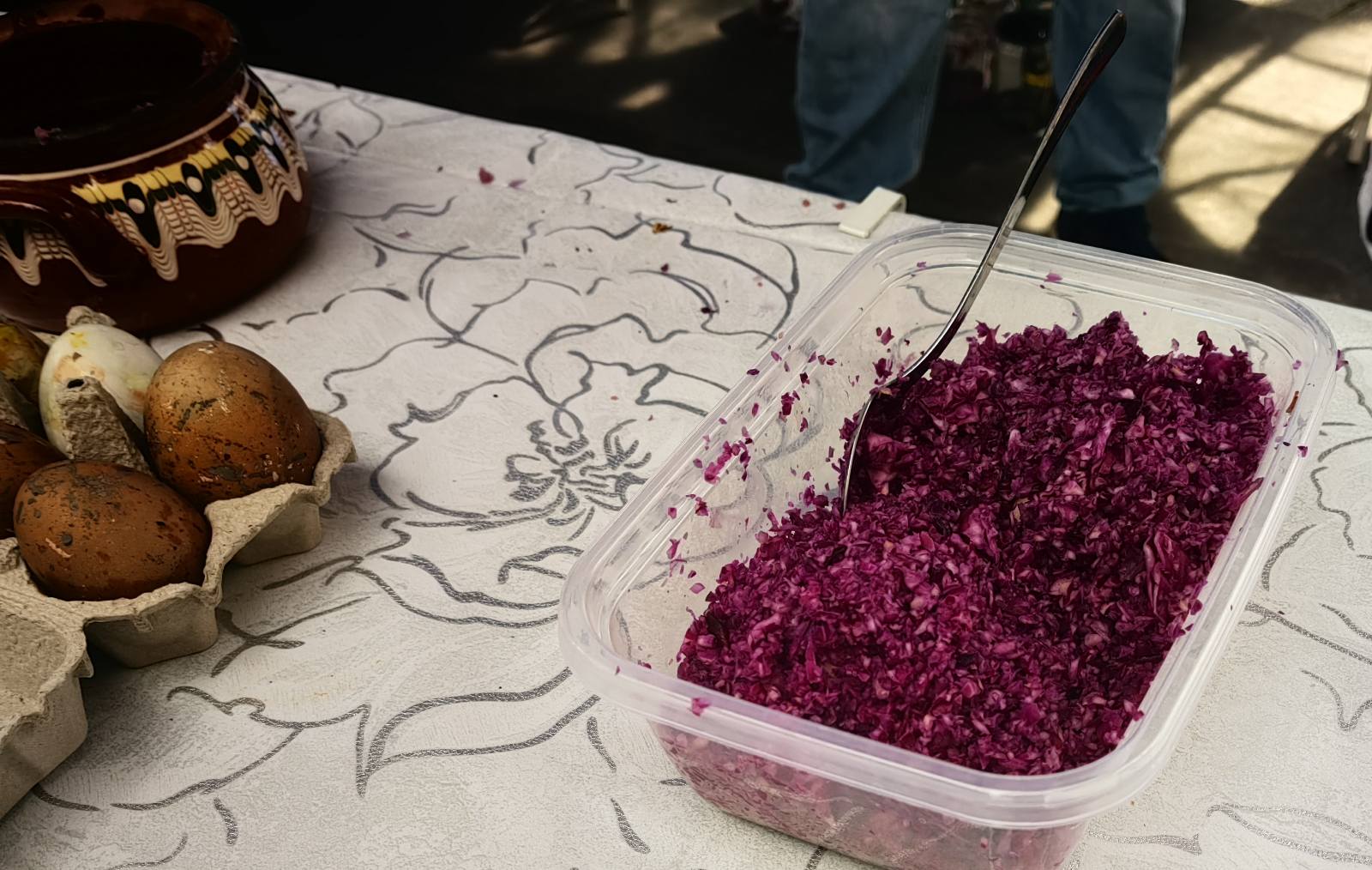 Една от интересните практики бе тази с червеното зеле. То се нарязва, добавя се оцет, а сварените яйца престояват цяла нощ в сместа. Именно тук участниците научиха и един практичен детайл - естествените бои цапат ръцете по-малко от част от готовите продукти за боядисване. При работа с червено зеле по ръцете остават следи, сравними с тези при рязане на салата, а не с интензивното оцветяване, което често оставят химическите бои.