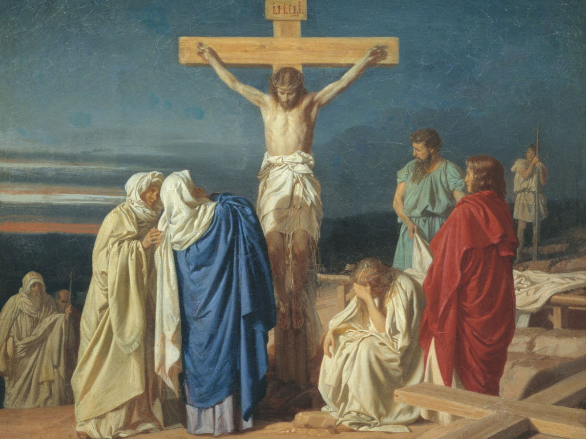 На лобното място, сред присмех и страдание, Христос е прикован на Кръста между двама разбойници, завършвайки земния си път, за да изкупи греховете на човечеството.