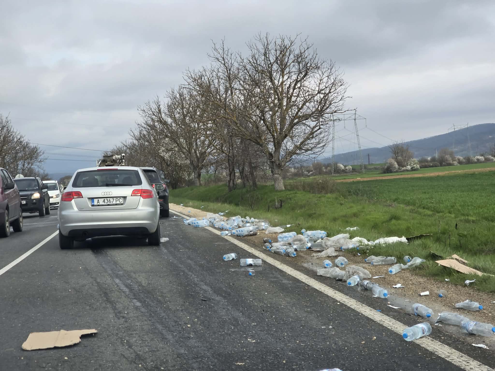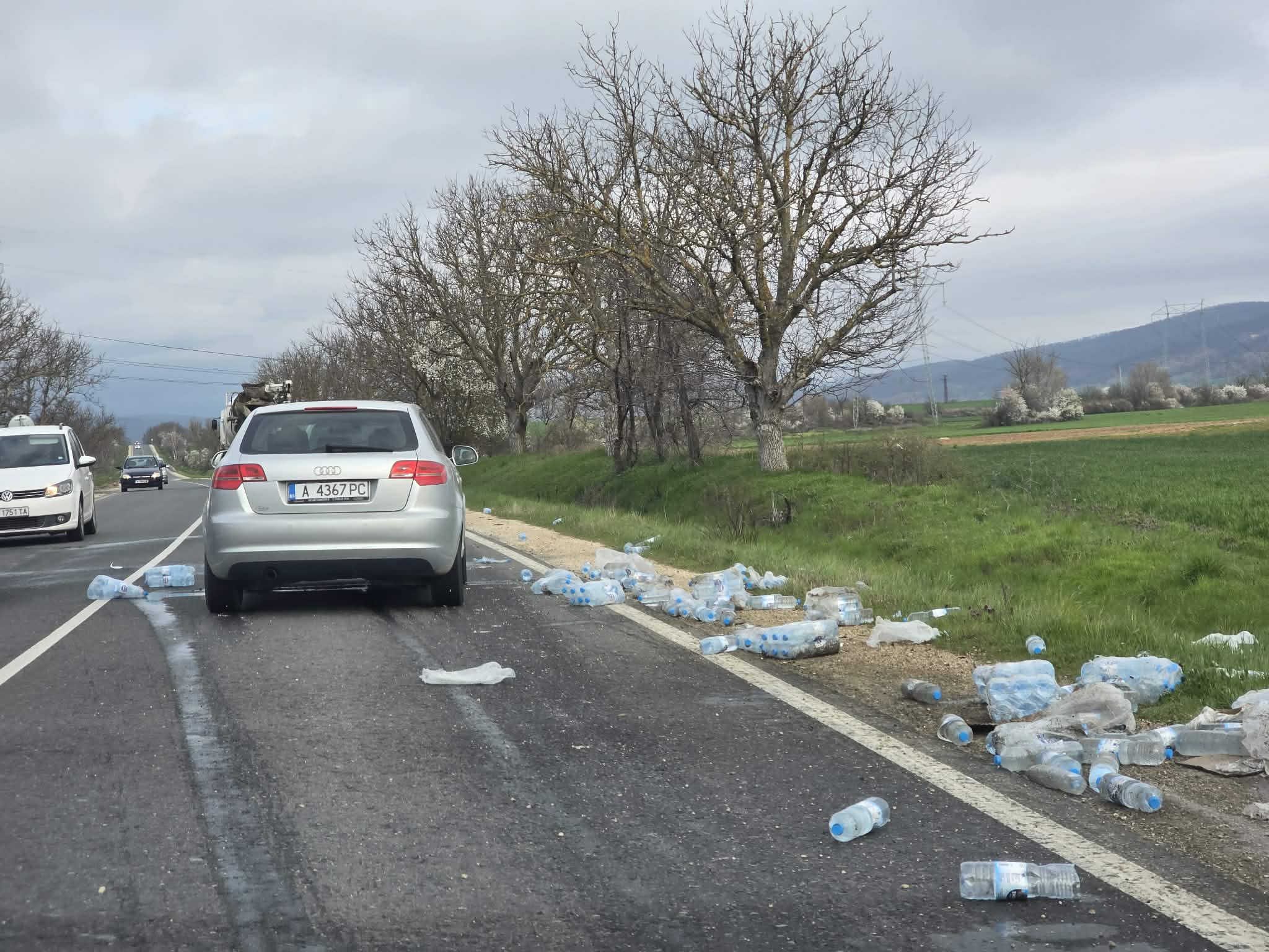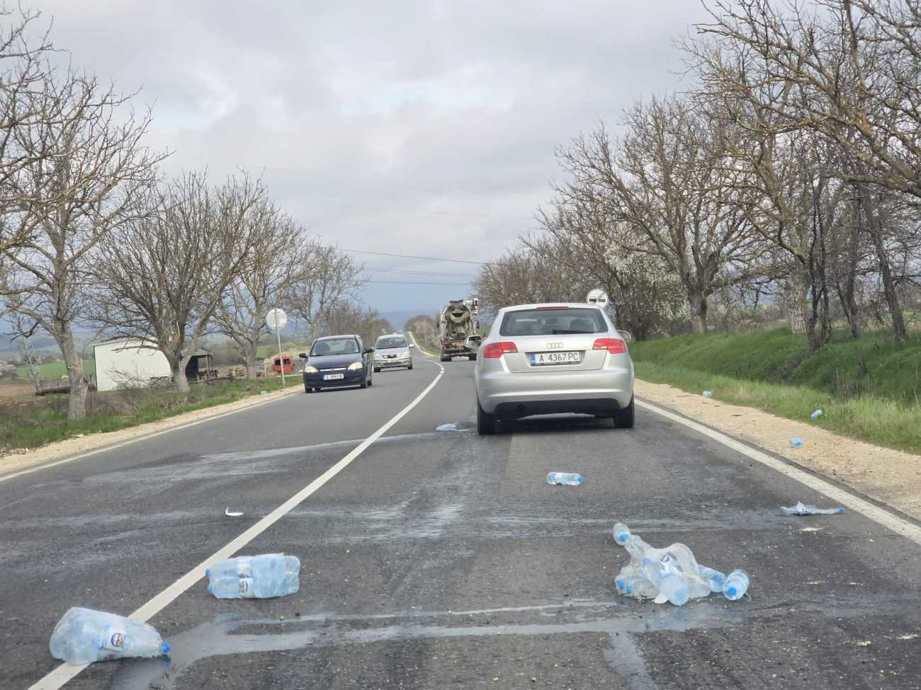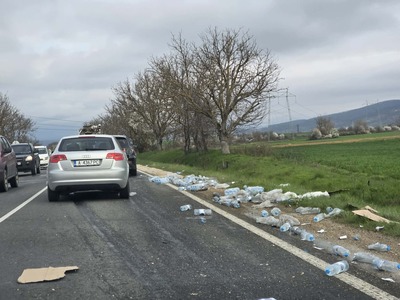 Най-вероятно товарът е паднал по време на движение. По снимките се виждат цели стекове и отделни бутилки, разпръснати на десетки метри. Това затруднява преминаването и създава опасност при разминаване, особено ако водачите реагират рязко.