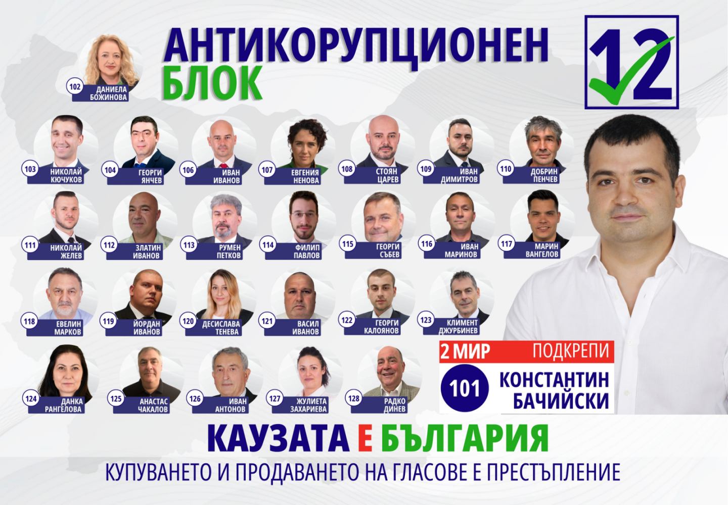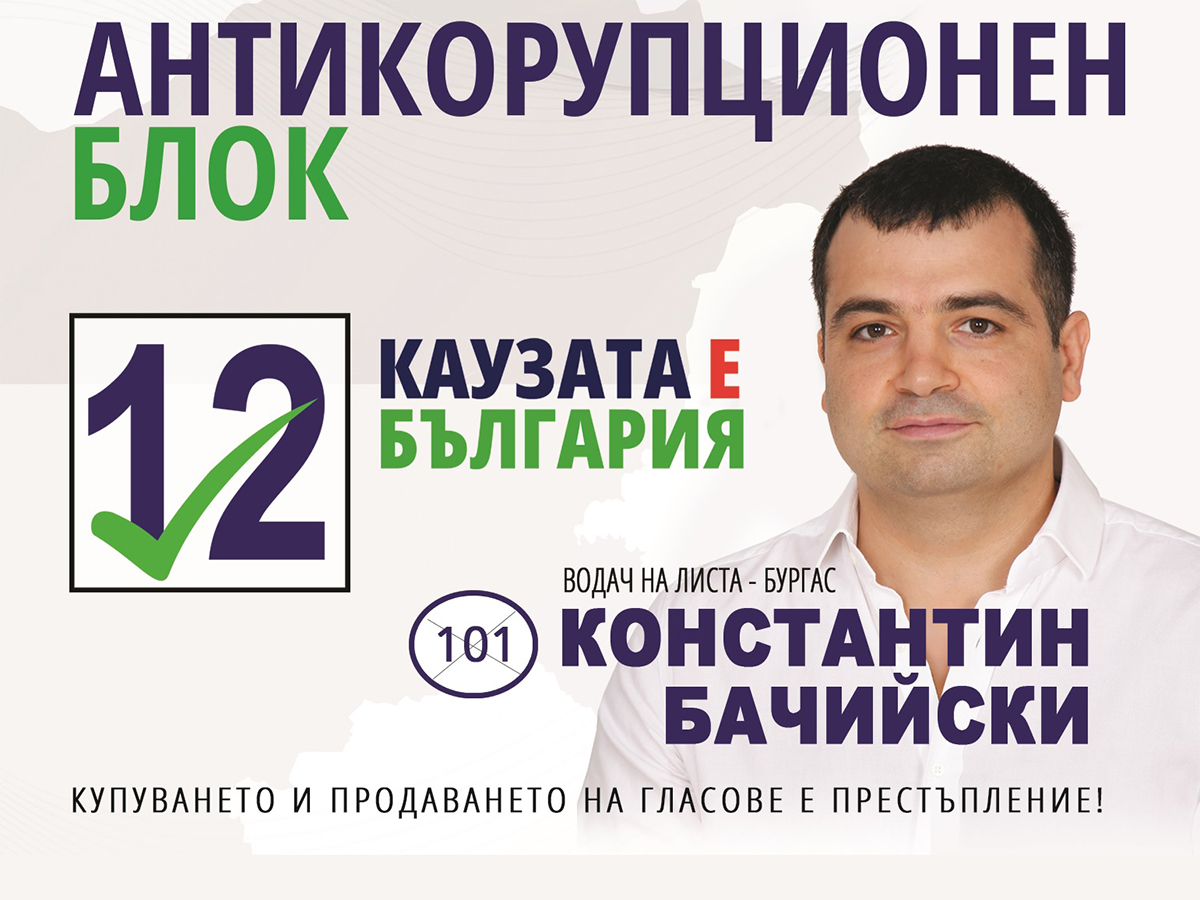 Начело на отбора застава име, което в Бургас няма нужда от дълго представяне. Водач на листата на Антикорупционния блок е Константин Бачийски – предприемач в сферата на информационните технологии и общественик с дългогодишен опит - първо като общински съветник, а след това и като народен представител в няколко парламента и член на антикорупционната комисия. За мнозина той е „острието“ в защита на обществения интерес и символът на непримиримостта срещу корупционните модели . През годините Бачийски доказа, че не се страхува да влиза в битки, които другите избягват – от защитата на държавните граници и територии до разкриването на сложни корупционни схеми, с което спечели доверието на хората, които ценят смелостта.