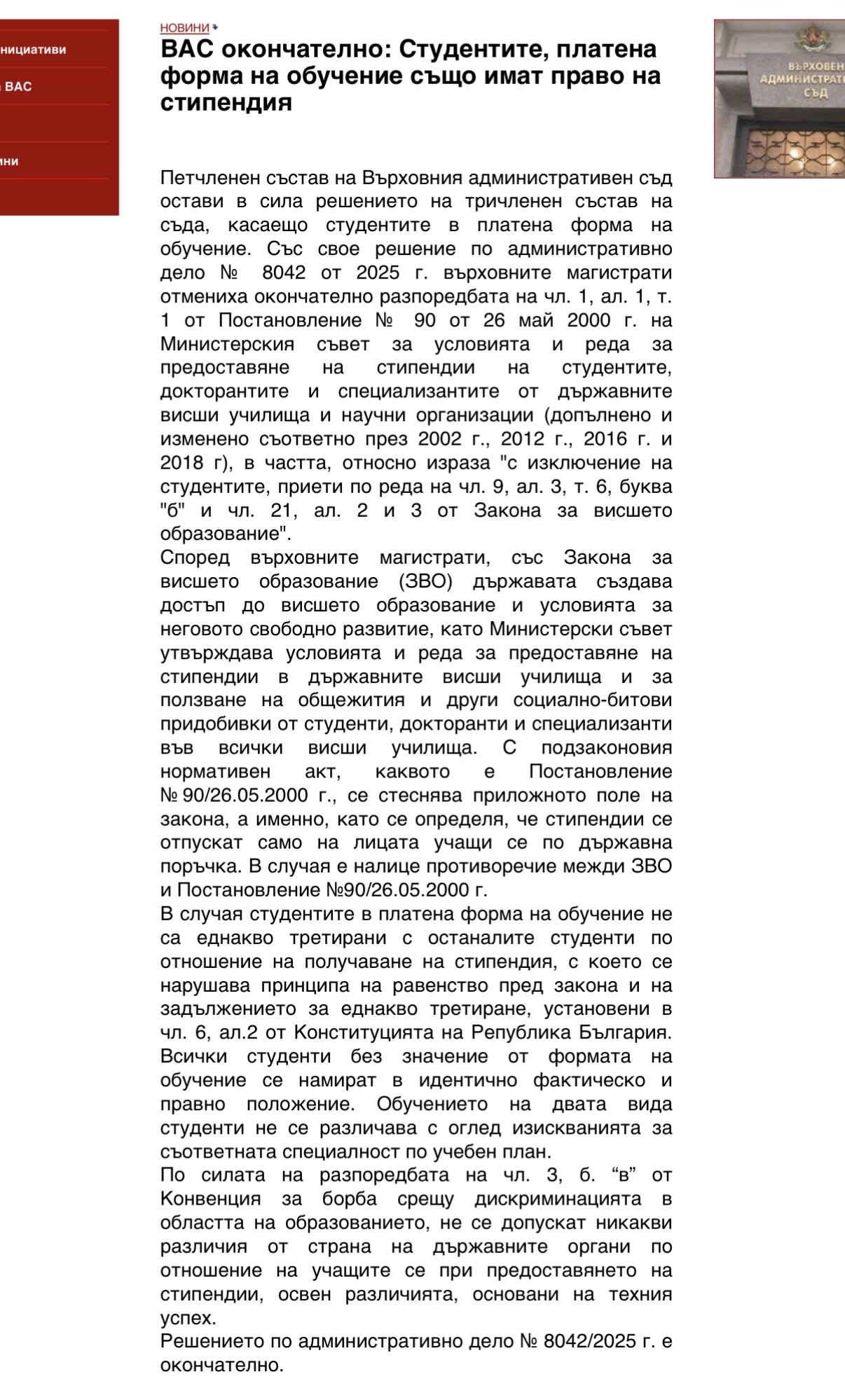 Тази практика обаче беше променена през 2025 г., когато Върховният административен съд се произнесе окончателно по казуса. Съдът остави в сила по-ранно решение, с което се отменя разпоредбата, ограничаваща достъпа до стипендии само за студентите в държавна поръчка, и призна правото на всички студенти да кандидатстват за финансово подпомагане.