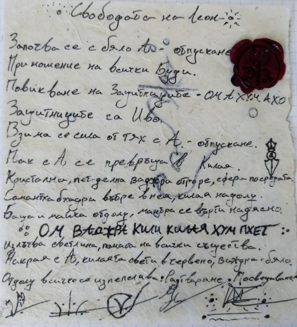 В единия ръкопис старателно е изписано заглавието „Свободата на Леон“ и подробно се описва как чрез ритуалния кинжал килая (пурба) детето трябва да „изпепели“ всичко старо в себе си. Ключовата фраза, изписана с ръката на Калушев, е кристално ясна: „Защитниците са Иво“.