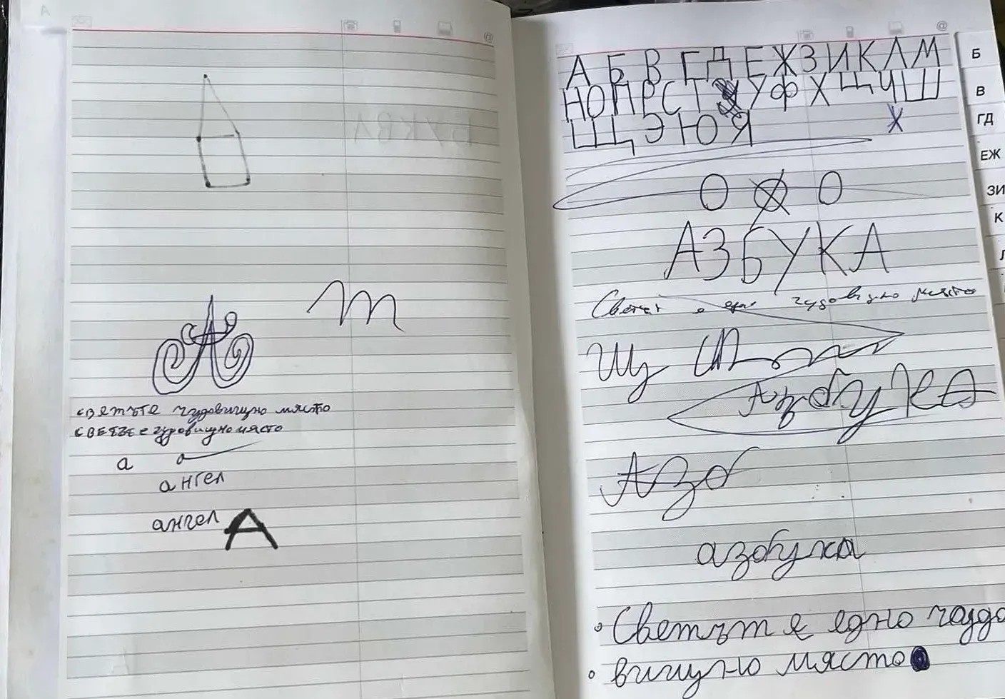 Пълната българска азбука с печатни и ръкописни букви, някои зачеркнати или преправени, е типично училищно упражнение за дете във възрастта на Леон. Азбуката е „приземяване“ на духовното във всекидневието. Калушев и сектата му са използвали всекидневни училищни задължения, за да вградят своето учение в нормалния живот на детето. Вместо да отделят „духовната практика“ от училището, те са я вплитали директно в него.