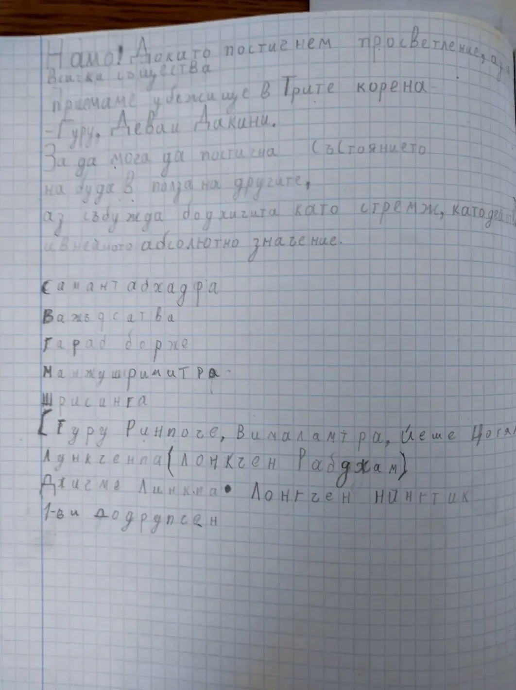 На страниците на бележника класическите будистки елементи се преплитат с всекидневни български училищни упражнения и християнски символи. Но това не е случайно, а част от целенасочена манипулация.