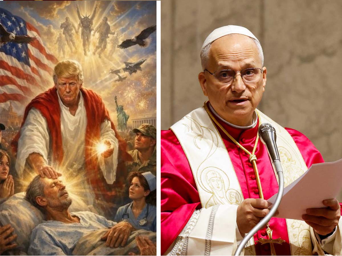 В неделя вечерта, докато се връщаше от уикенда си във Флорида, американският президент публикува първо в социалната си мрежа "Трут Соушъл" дълга атака срещу папа Лъв XIV. Четиридесет и шест минути по-късно последва изображение, създадено с изкуствен интелект (AI). На него Тръмп беше облечен в роба в бяло и червено, а с една ръка докосваше челото на болен човек. Около него стояха медицинска сестра и войник, а на небето вместо ангели имаше бойци, орли и изтребители, посочва "Шпигел".