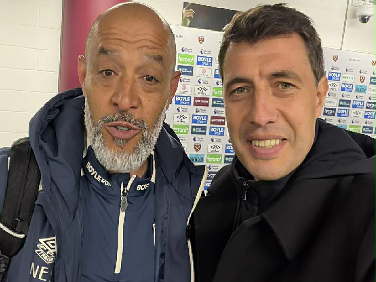 52-годишният специалист си спомни времената на своята футболна кариера в разговор с финансиста Кирил Евтимов. Това се случи след победата на "чуковете" с 4:0 над Уулвърхемптън. Бългазлията бе сред гостите на "Лондон Стейдиъм" и това му даде шанс да се види с португалеца.