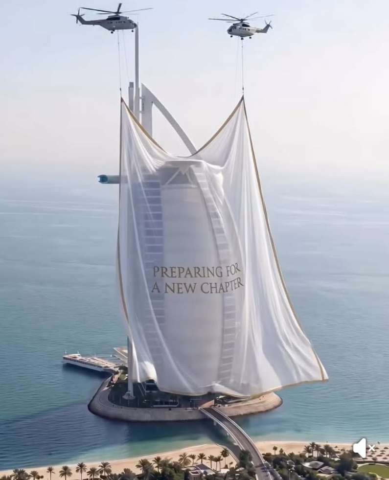 Визуална концепция с изкуствен интелект, представя временното затваряне на Бурж Ал Араб за ремонт. Пожелаваме на тази икона на Дубай плавна трансформация и очакваме с нетърпение скорошното ѝ грандиозно повторно отваряне.