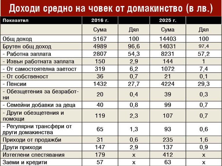 Доходите от пенсии средно на човек са нараснали 2,9 пъти за период от 10 години. Пенсиите формират 29,3 на сто от всички доходи на домакинствата. Като към пенсиите добавим изплащаните обезщетения за безработица, семейните добавки за деца и другите обезщетения и помощи се оказва, че 31 на сто от всички доходи на домакинствата в страната идват от държавния бюджет.
