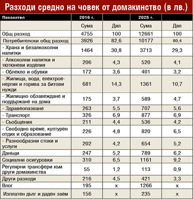През миналата година средният разход на човек е бил 12 661 лв., което прави по 1055 лв. на месец или по близо 540 евро, показват данните на НСИ. Тези разходи са ниски на фона на сегашните средни заплати в страната. Но националната статистика изчислява доходите и разходите средно на човек от домакинствата. Тоест в едно семейство дори родителите да са с високи заплати, ако има деца, безработен или пенсионер, средният доход на човек, а съответно и средният разход, намалява значително.