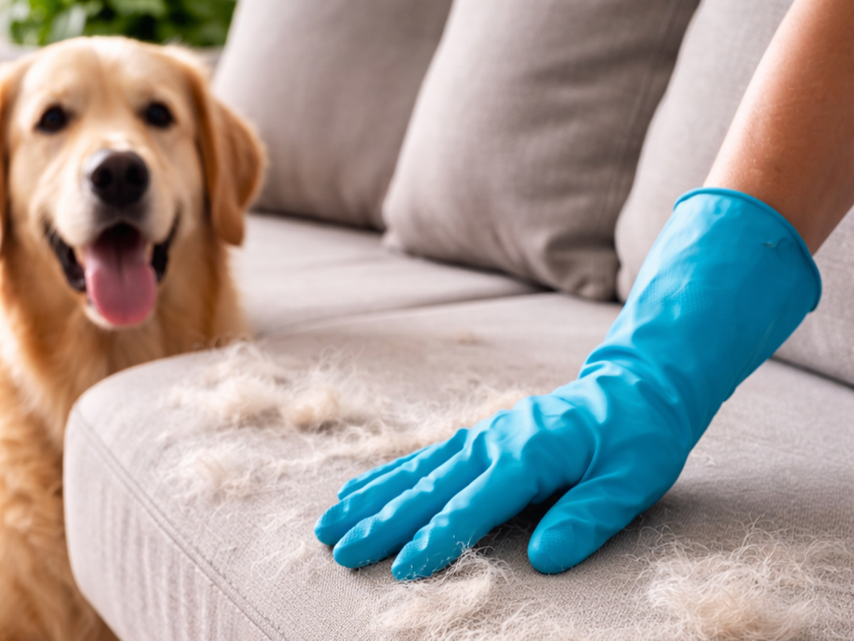 Когато космите попаднат върху диван или килим, те не остават просто на повърхността. Част от тях се вплитат в нишките, особено ако тъканта е по-мека, релефна или статично заредена. Затова обикновеното минаване с ръка или суха кърпа често не помага достатъчно. Един от най-практичните домашни методи е използването на леко навлажнена гумена ръкавица или силиконова чистачка за стъкло. Именно гумата създава съпротивление, което събира космите на едно място и ги отделя много по-лесно от текстила.