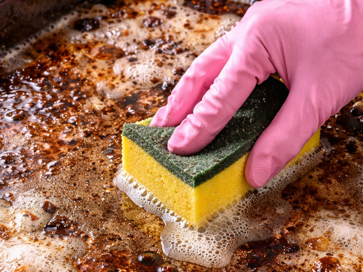 Когато една тава е силно загоряла, първата грешка е да се започне веднага с ожесточено търкане. Това не само изморява, но често не дава желания резултат. Много по-разумно е първо да се размекне натрупаното замърсяване. Един от най-изпитаните домашни методи включва гореща вода, сода за хляб и малко оцет или препарат за съдове. Именно тази комбинация помага загорелите остатъци да започнат да се отделят значително по-лесно.