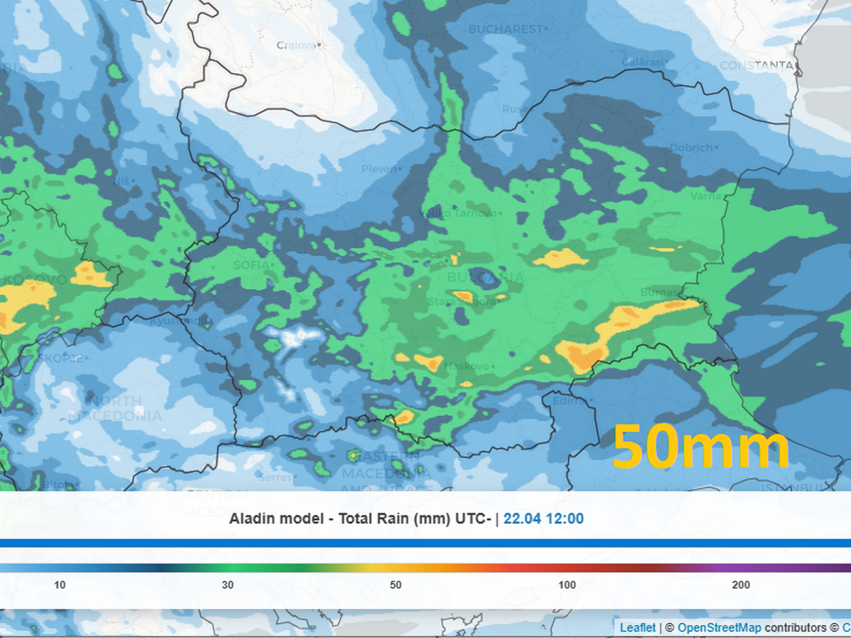 Според последните прогнози на модела ALADIN, сумарните количества валежи в страната могат да достигнат до около 50 мм/кв.м до 22 април. Най-интензивни ще бъдат валежите в централните и южните райони, докато в крайните северозападни части ще остане почти без съществени превалявания.
