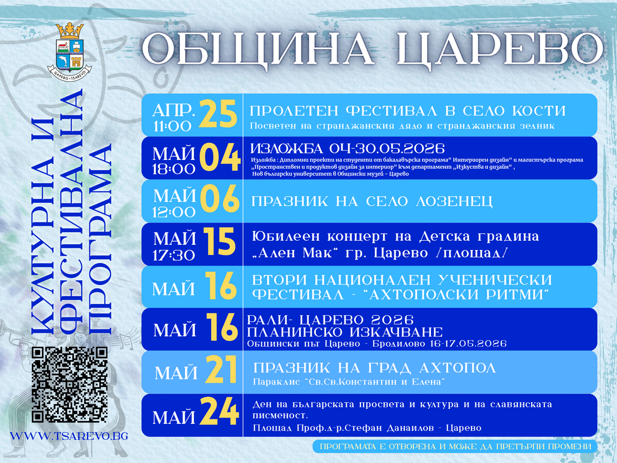 С настъпването на пролетта, Царево се преобразява в истински културен център, който предлага богата палитра от събития. Програмата за месец май обещава да донесе незабравими преживявания, вдъхновение и празнично настроение за всички жители и туристи на общината.