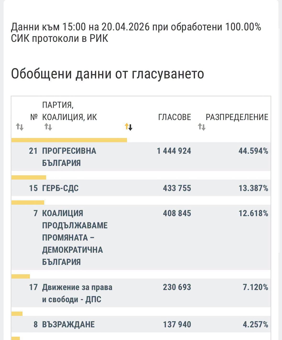 За формацията на Радев са гласували 1 444 924 души. За ГЕРБ-СДС - 433 755, следвани от ПП-ДБ, които имат 408 845 гласа. За ДПС са гласували 230 693 души, следвани от "Възраждане" с 137 940 гласа. МЕЧ, които остават под чертата, имат 104 506 гласа. "Величие" пък има повече гласове от БСП - 100 572 на 97 753. 93 554 гласа имат "Сияние", които получават 2.887% от гласовете.