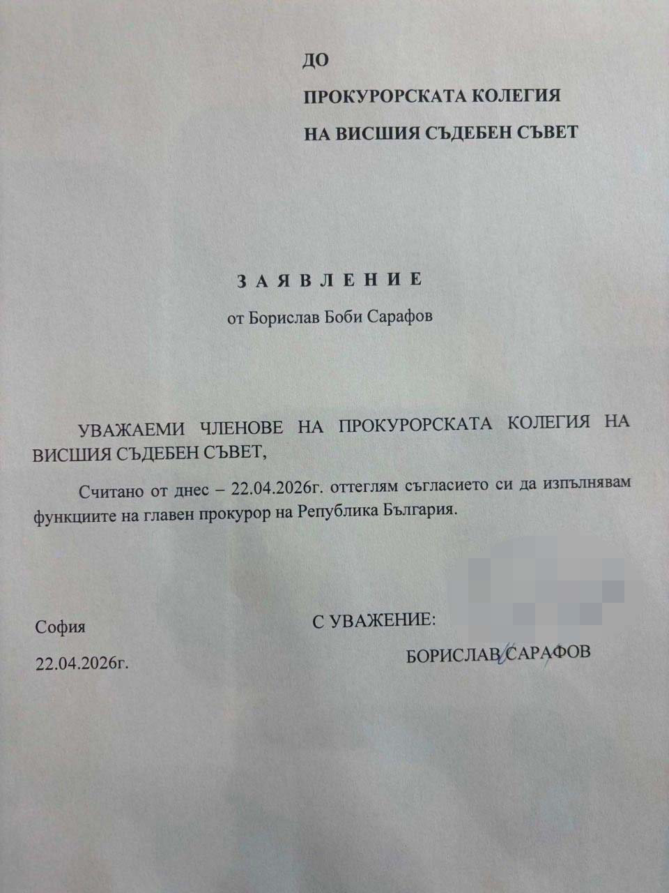 Считано от днес – 22.04.2026 г. оттеглям съгласието си да изпълнявам функциите на главен прокурор на Република България.