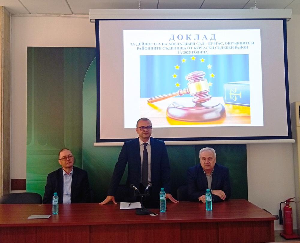 В доклада е посочено, че през 2025 година в Бургаския апелативен съд са постъпили за разглеждане 979 броя дела. Със съдебен акт по същество са приключили 92,95% от общо свършените дела. В тримесечен срок са решени 82% от делата.