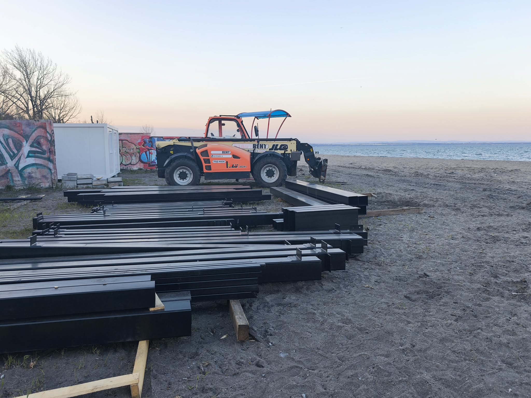 В последните дни на ивицата вече се вижда първият знак за бъдещата концепция. Започнал е монтажът на едно от заведенията, разположено почти в края на плажа, възможно най-далеч от основния поток. Това подсказва намерение тази част да бъде развита като вечерна и нощна зона.
