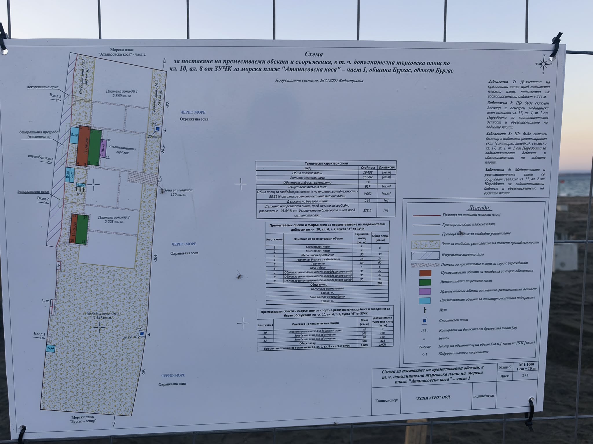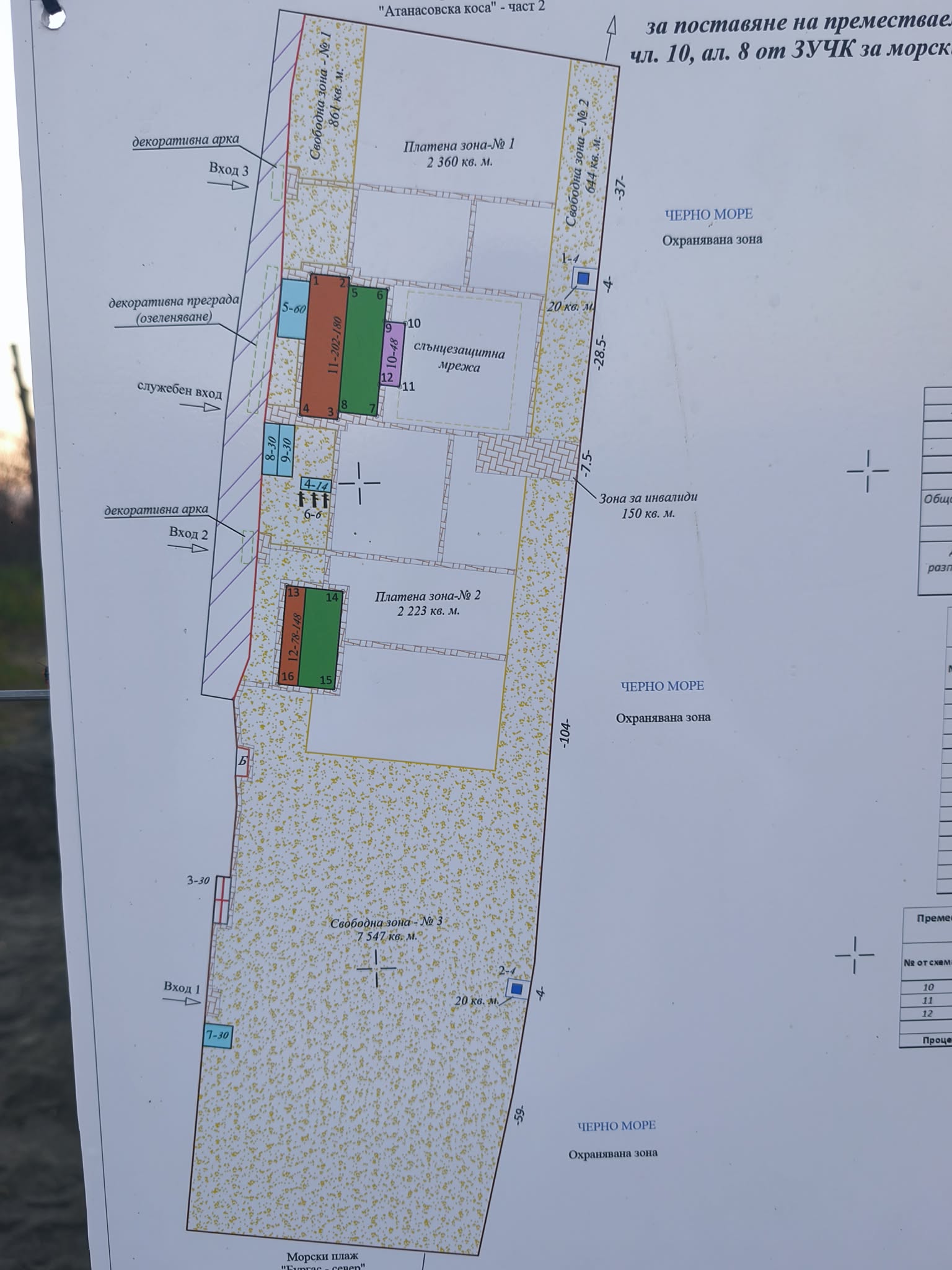 Одобрената схема показва ясно как ще бъде разпределена територията. Плажът разполага с две платени зони. Платена зона №1 е с площ 2 360 кв. м, и платена зона №2 е с площ 2 223 кв. м. Наред с тях са предвидени и свободни зони, като най-голямата от тях е свободна зона №3 с площ 7 547 кв. м.
