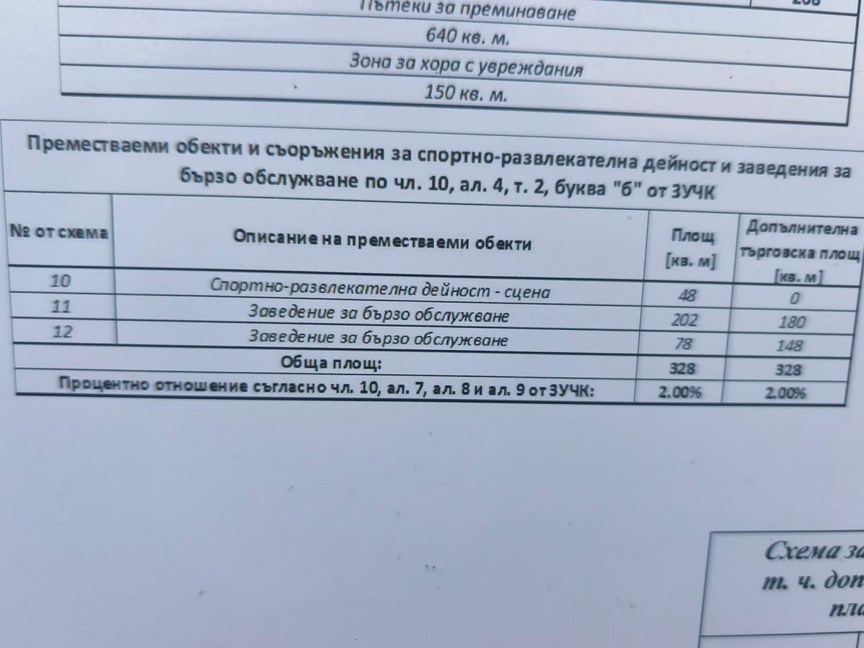 Търговската и развлекателната част от своя страна включва три обекта с обща площ 328 кв. м. Първият е за спортно-развлекателна дейност и сцена с площ 48 кв. м. Другите два са заведения за бързо обслужване. Едното е с площ 202 кв. м и допълнителна търговска площ 180 кв. м. Второто е с площ 78 кв. м и допълнителна търговска площ 148 кв. м. Така общата допълнителна търговска площ също достига 328 кв. м.