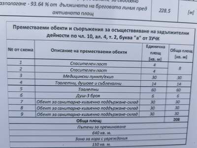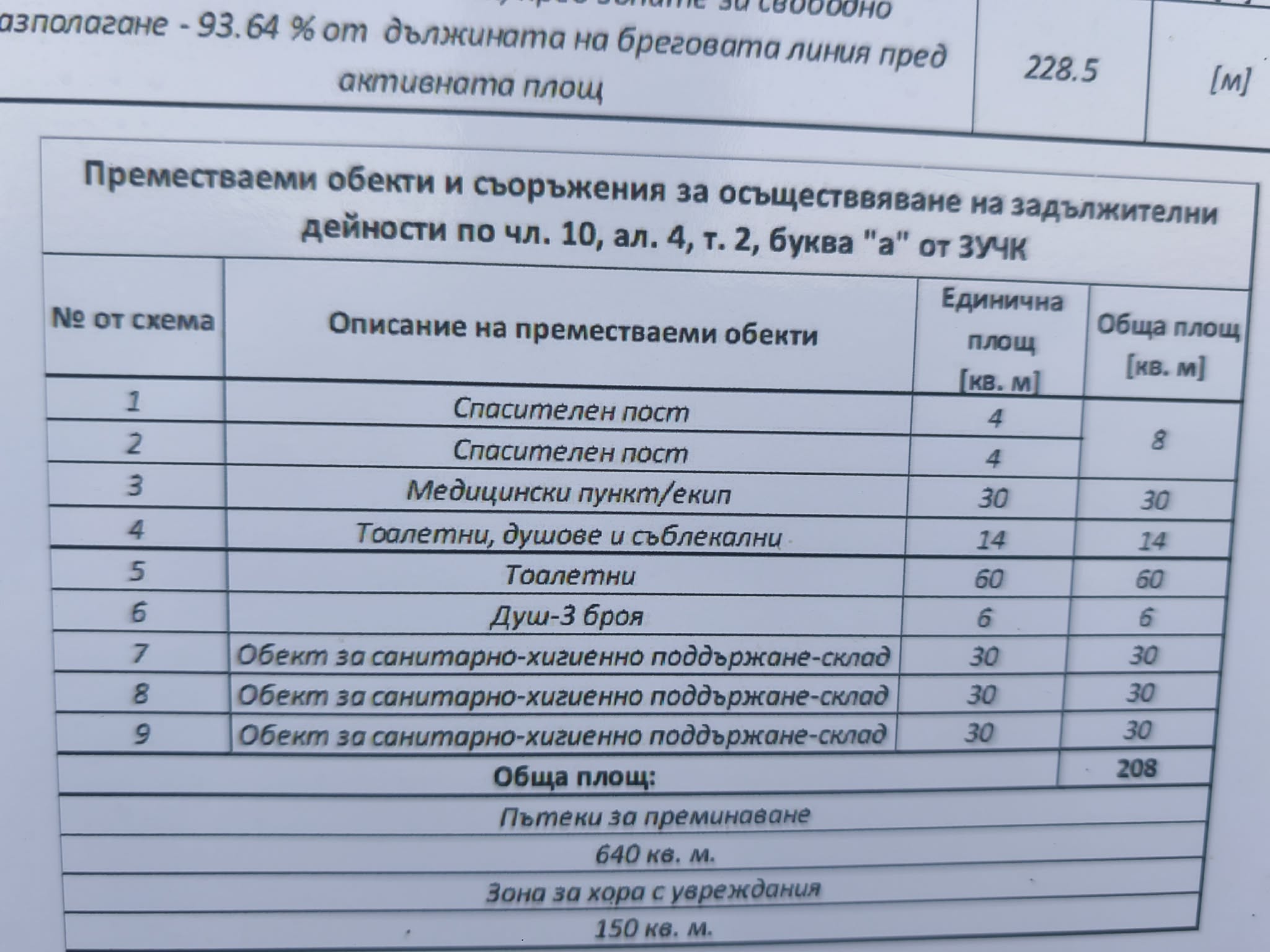Задължителните обекти по чл. 10, ал. 4, т. 2, буква „а“ от Закона за устройството на Черноморското крайбрежие са с обща площ 208 кв. м. В тях влизат два спасителни поста по 4 кв. м, или общо 8 кв. м, медицински пункт с площ 30 кв. м, обект за тоалетни, душове и съблекални с площ 14 кв. м, отделен обект за тоалетни с площ 60 кв. м, три душа с площ 6 кв. м, както и три обекта за санитарно-хигиенно поддържане и склад, всеки по 30 кв. м.