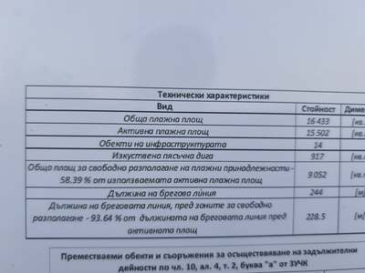 По схемата е отбелязано, че свободното разполагане достига 93.64% от дължината на бреговата линия пред активната площ. Самата брегова линия е 228.5 метра. За хора с увреждания е отделена зона от 150 кв. м. Предвидени са и пътеки за преминаване с обща площ 640 кв. м.