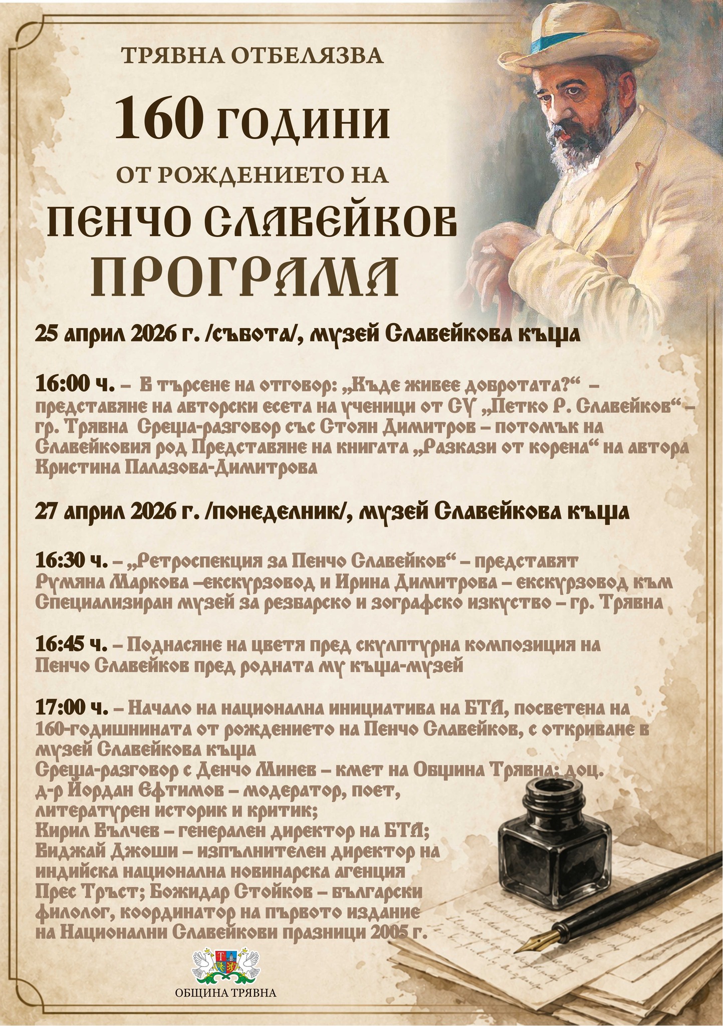 На 27 април 2026 г. се навършват 160 години от рождението на Пенчо Славейков - един от най-значимите български поети, писатели и общественици. Той е роден на днешната дата, през 1866 г. в Трявна и е най-малкият син на възрожденския поет, публицист и общественик Петко Рачов Славейков.