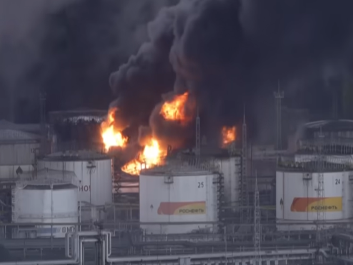 Главното управление на Министерството на извънредните ситуации за Краснодарския край в РФ предупреди, че горящи нефтопродукти се разлети по една от градските улици, след взрив на горяща цистерна. Петрол от разрушените резервоари се излива в местната река и оттам в морето, алармират граждани.