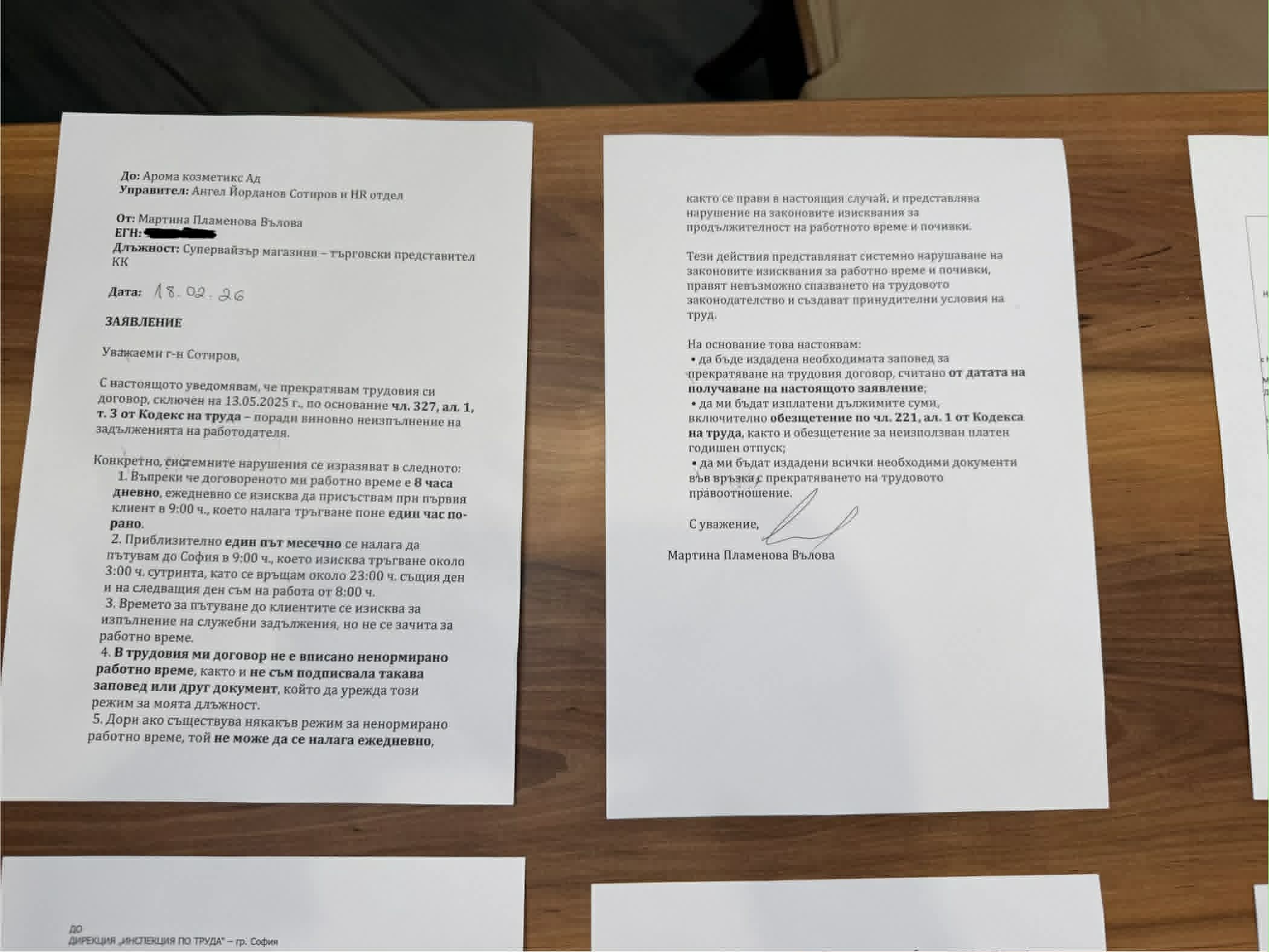 "Работих в козметична компания, където бях подложена на системни нарушения на трудовите ми права - неизплащане на командировъчни средства по време на работа, полагане на извънреден труд, който не е отчетен и заплатен, неспазване на задължителната междудневна почивка, неправомерни твърдения за ненормирано работно време, каквото не е уговорено в трудовия ми договор, работа по време на болничен, както и неправилно отразяване на основанието за прекратяване на трудовото правоотношение, включително подаване на некоректни данни към НАП”.