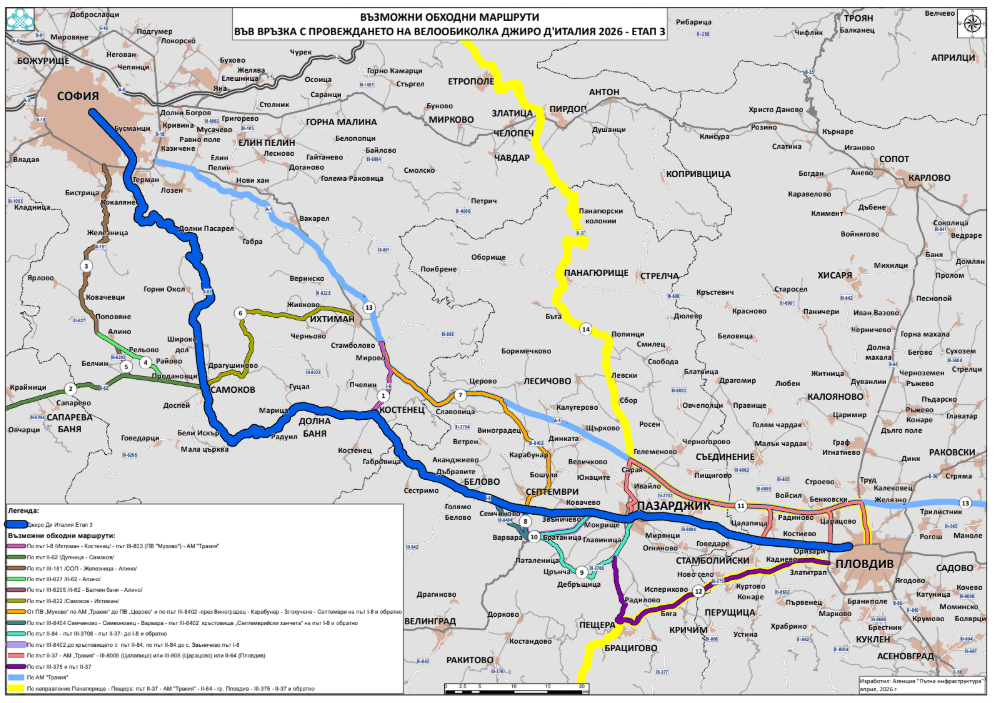 От 8 май /петък/ до 10 май /неделя/ за провеждане на колоездачната обиколка Giro dItalia – Bulgaria Grande Partenza, поетапно ще се ограничава движението в отделни участъци от републиканските пътища. Временната промяна ще обхваща отсечки от първокласната, второкласната и третокласната пътна мрежа в областите Бургас, Сливен, Ямбол, Велико Търново, Пловдив, Пазарджик и Софийска.