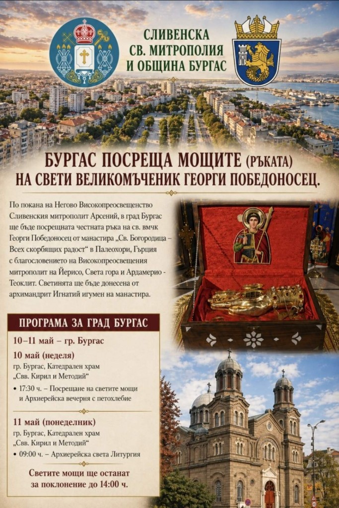 В Бургас ще бъде посрещната честната ръка на свети великомъченик Георги Победоносец. Светинята ще пристигне в катедралния храм „Св.св. Кирил и Методий“ на 10 май по покана на Негово Високопреосвещенство Сливенския митрополит Арсений и с благословението на Високопреосвещения митрополит на Йерисо, Света гора и Ардамерио Теоклит.