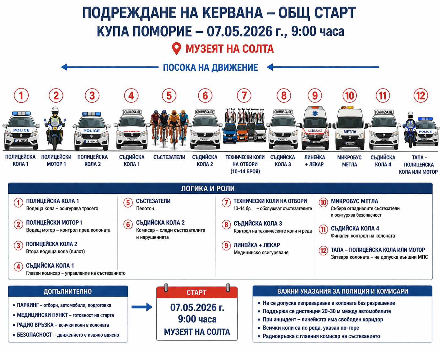 За първи път в 109-годишната си история, една от най-престижните колоездачни обиколки в света Giro d’Italia ще стартира от България. Бургас ще бъде домакин и основен център на първите два етапа, като финалът на откриващия етап (8 май 2026 г.) ще бъде именно тук, на нашето крайбрежие. Ден преди това обаче, приканваме всички ентусиазирани и лицензирани в БФК колоездачи да се включат в почетната обиколка, наречена с усмивка Giro d’Pomorie. Обиколката ще има състезателен характер и ще стартира в 10 часа от Музея на солта в Поморие. Състезателите ще бъдат разпределени в няколко възрастови групи, а награди ще има за първите трима от всяка възраст. Повече за събитието може да прочетете по-долу.