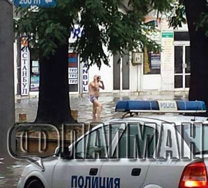 Човекът е на видима възраст около 60 години и истински се забавлява от потопа. Наводнението на бул. „Иван Вазов” и преките улици е огромно