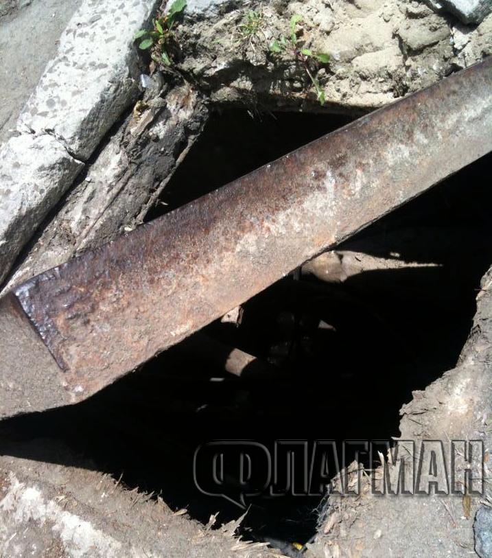 Още в края на миналата година Флагман.БГ алармира за запушени и опасни шахти в Бургас (ВИЖ ТУК). Голяма част от тях бяха с липсващи капаци, които били откраднати от цигани и продадени за старо желязо. В случая се касае за още по-опасна шахта, която има капак, но той е само за заблуда на хората. Ако някой стъпи върху него, директно пропада в дълбоката дупка.